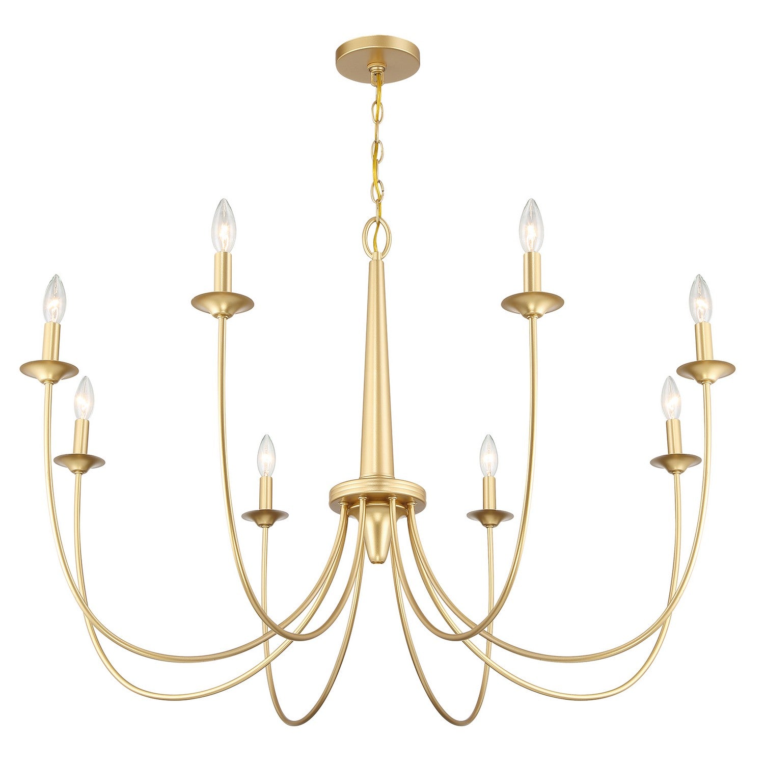 From Savoy House, the Stonecrest 8-light chandelier is a superb way to adorn your home with rustic yet glamorous style. Slim, dramatically curving arms showcase minimal yet beautiful candle cups. The central column also features a thoughtful touch of down-home detailing. It's all decorated in French Gold, a textured and intriguing finish. Bryant is 28" in height and 42" in width. Uses eight candelabra size bulbs of up to 60 watts per bulb. Bulbs not included.