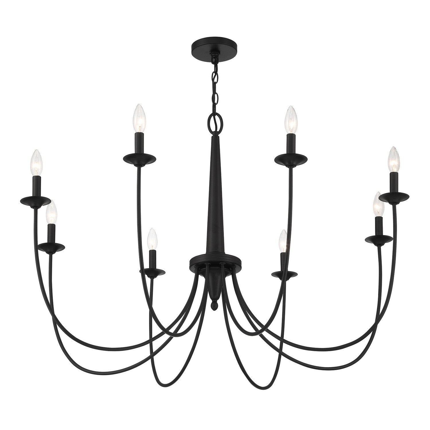 From Savoy House, the Stonecrest 8-light chandelier is a superb way to adorn your home with rustic yet dramatic style. Slim, dramatically curving arms showcase minimal yet beautiful candle cups. The central column also features a thoughtful touch of down-home detailing. It's all decorated in Matte Black. Bryant is 28" in height and 42" in width. Uses eight candelabra size bulbs of up to 60 watts per bulb. Bulbs not included.