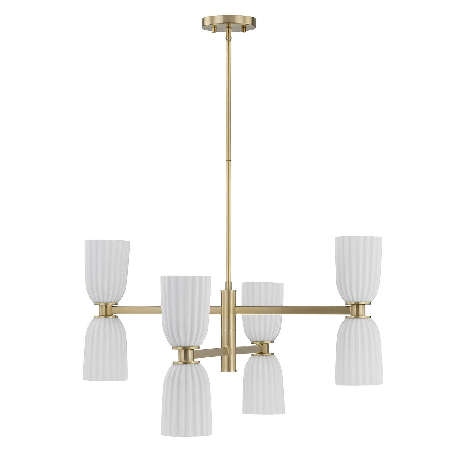 The Savoy House Baldwin 8-light chandelier invites you to reimagine your lighting style. A minimal frame finished in Noble Brass supports eight ribbed opal glass shades that radiate soft, sculptural presence. Adjustable, pivoting arms let you personalize the silhouette to suit your space. Baldwin is 30" in width and has an adjustable height ranging from 20.75" to 71.75". It uses eight standard size bulbs of up to 60 watts per bulb. Bulbs not included. Comes with eight 12" downrods and two 6" downrods.