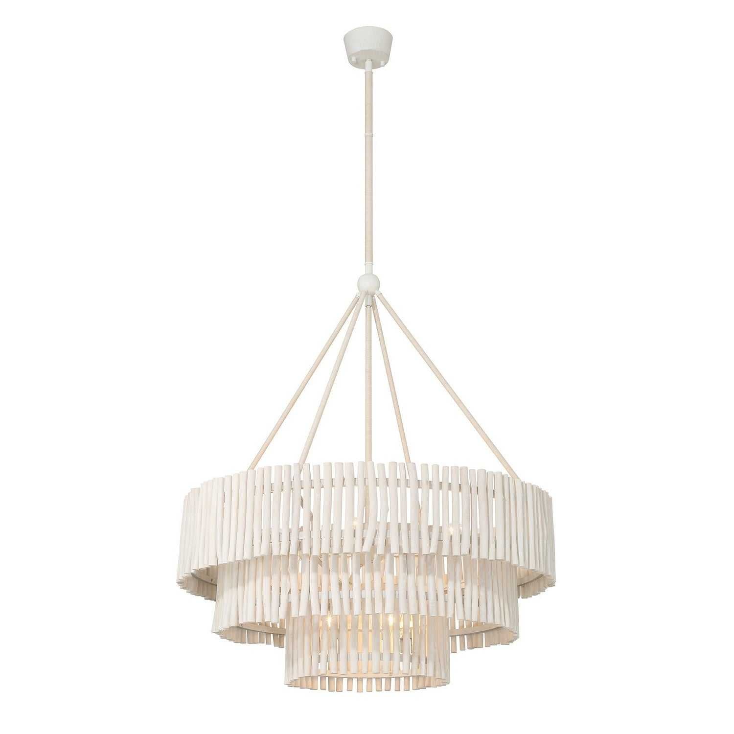 The Savoy House Phong 9-light chandelier was designed by award-winning interior designer and TV host Breegan Jane. Raised in California and now living in Ibiza, Breegan brings her love of seaside living into every detail of this design. Three tiers of white-washed wood embrace the perfect imperfection of organic materials, radiating a breezy, relaxed coastal mood. The Blanco finish enhances that easygoing warmth. Phong is 30" wide and has an adjustable height ranging from 35.75" to 89.75". It uses nine candelabra size bulbs of up to 60 watts per bulb. Bulbs not included. Comes with four 12" downrods and one 6" downrod.