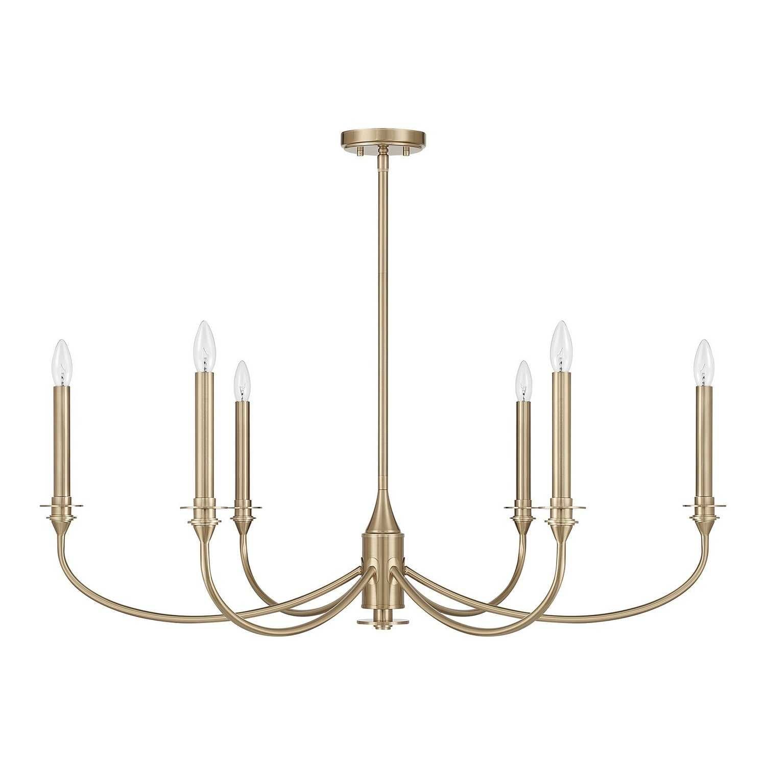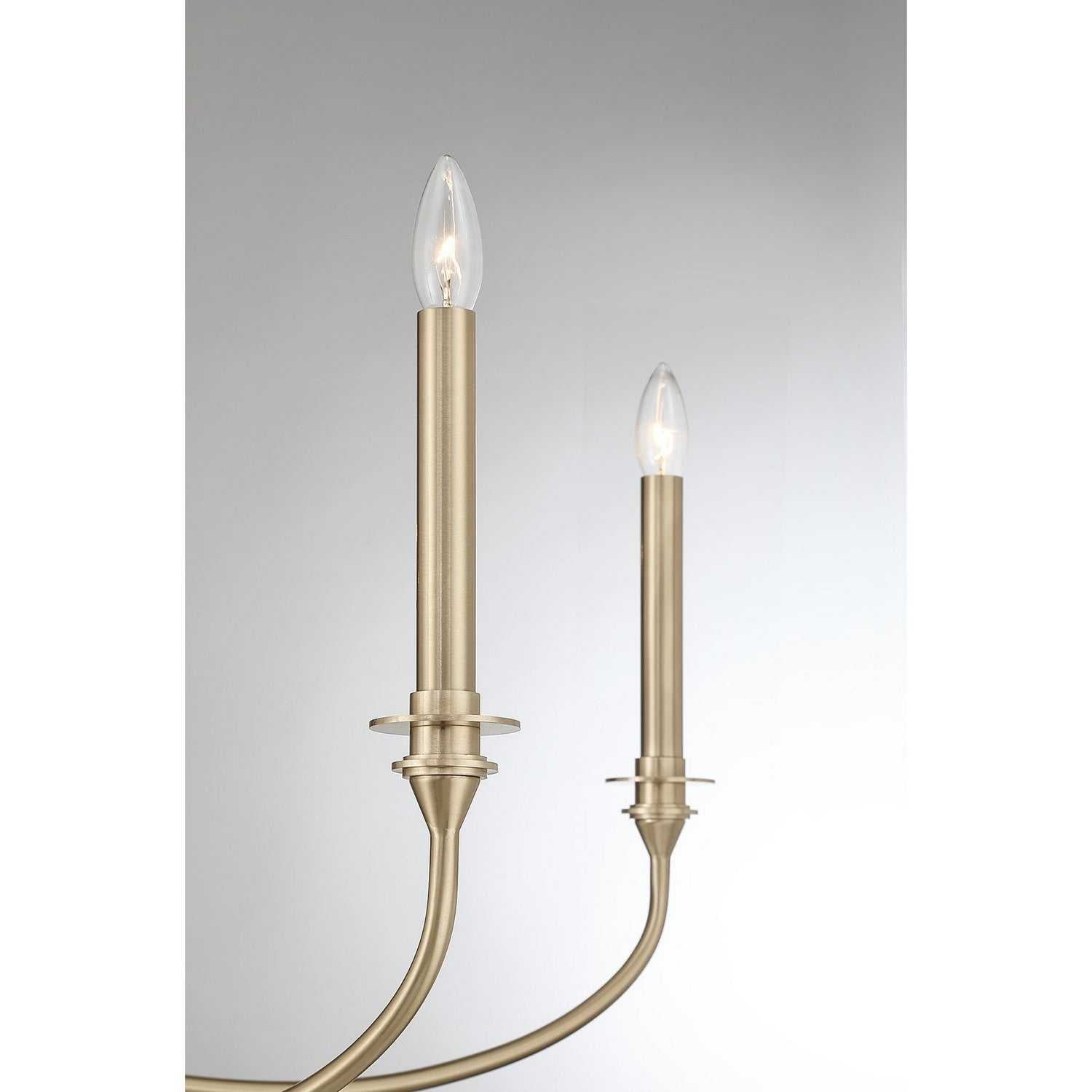 The Savoy House Coventry 6-light chandelier captures the essence of New Traditional style with its graceful arms, tall candle covers, and beautifully balanced silhouette. Finished in Noble Brass, it brings a bright, uplifting warmth that instantly elevates the room. This design shines with timeless sophistication while still feeling fresh and inviting. Coventry is 40" wide and features an adjustable height from 18.75" to 60.75". It uses six candelabra size bulbs of up to 60 watts each (not included) and comes with four 12" downrods and one 6" downrod.