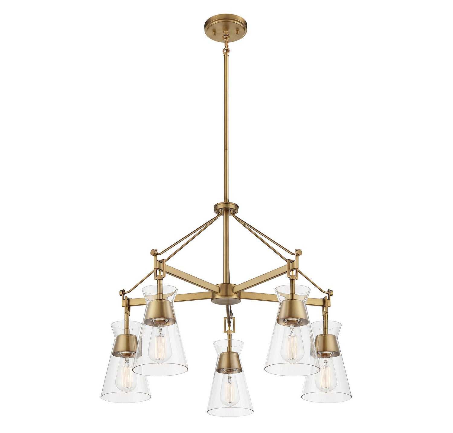 Conical shades of clear glass recall Italian midcentury modern lighting designs in the stylish Lakewood 5-light chandelier from Savoy House. The fixture is finished in rich warm brass. Lakewood is 28" in diameter and has an adjustable height ranging from 26" to 72". It uses five standard size bulbs with a max of 60 watts per bulb. Comes with four 12" downrods and one 6" downrod, plus 80" of cord.