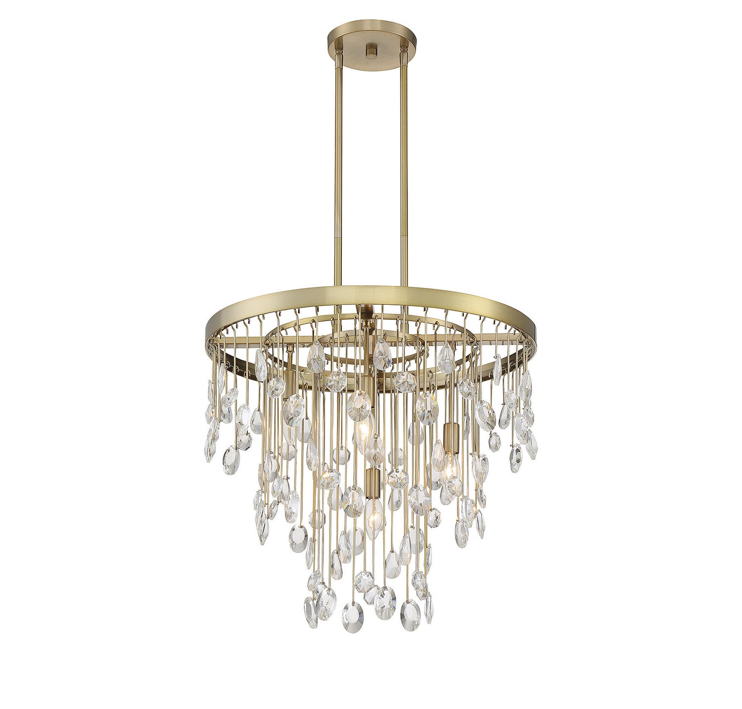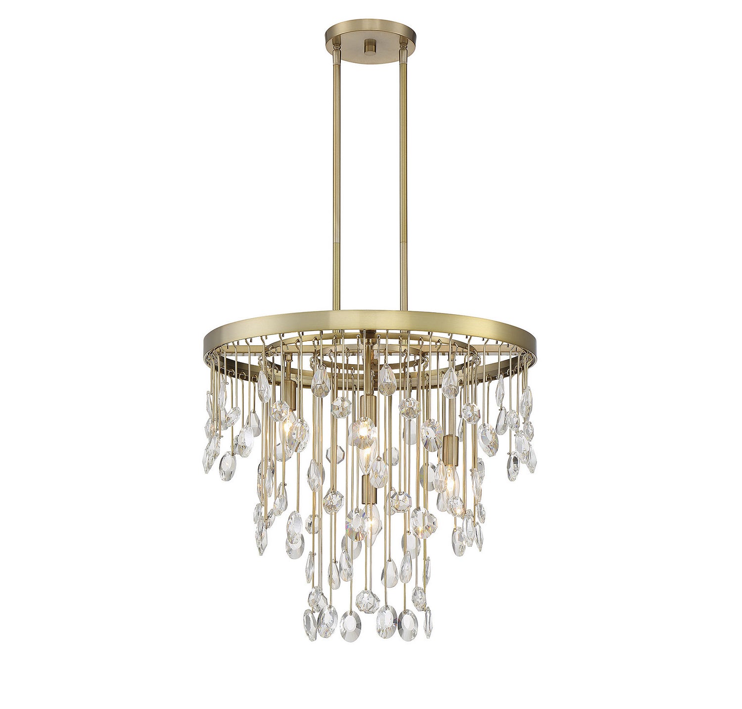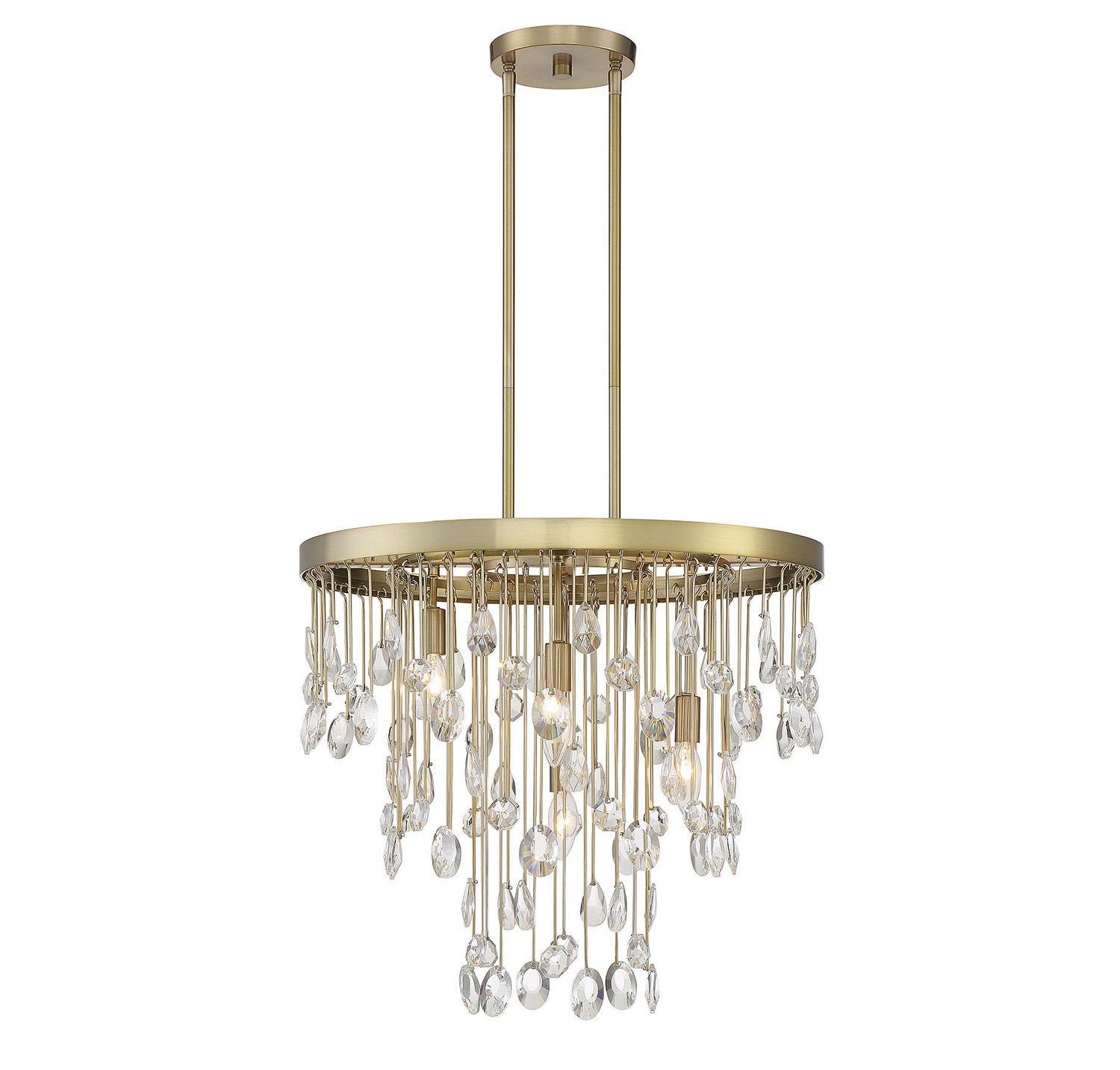 If you are looking for lighting that makes a big style statement, look no further than this Savoy House Livorno 4-light pendant. Every aspect of Livorno is thoughtfully designed to create the biggest impact, from the lights that hang at different heights to the 3 tiers of beautifully faceted crystals in different shapes and sizes. This is the perfect way to indulge your craving for updated Hollywood Regency glamour in any room, including foyers, living rooms, kitchens and bedrooms. Finished in Noble Brass. This fixture is 21" wide and has an adjustable height that ranges from 25" to 71". Uses 4 candelabra size bulbs of up to 60 watts each (not included).