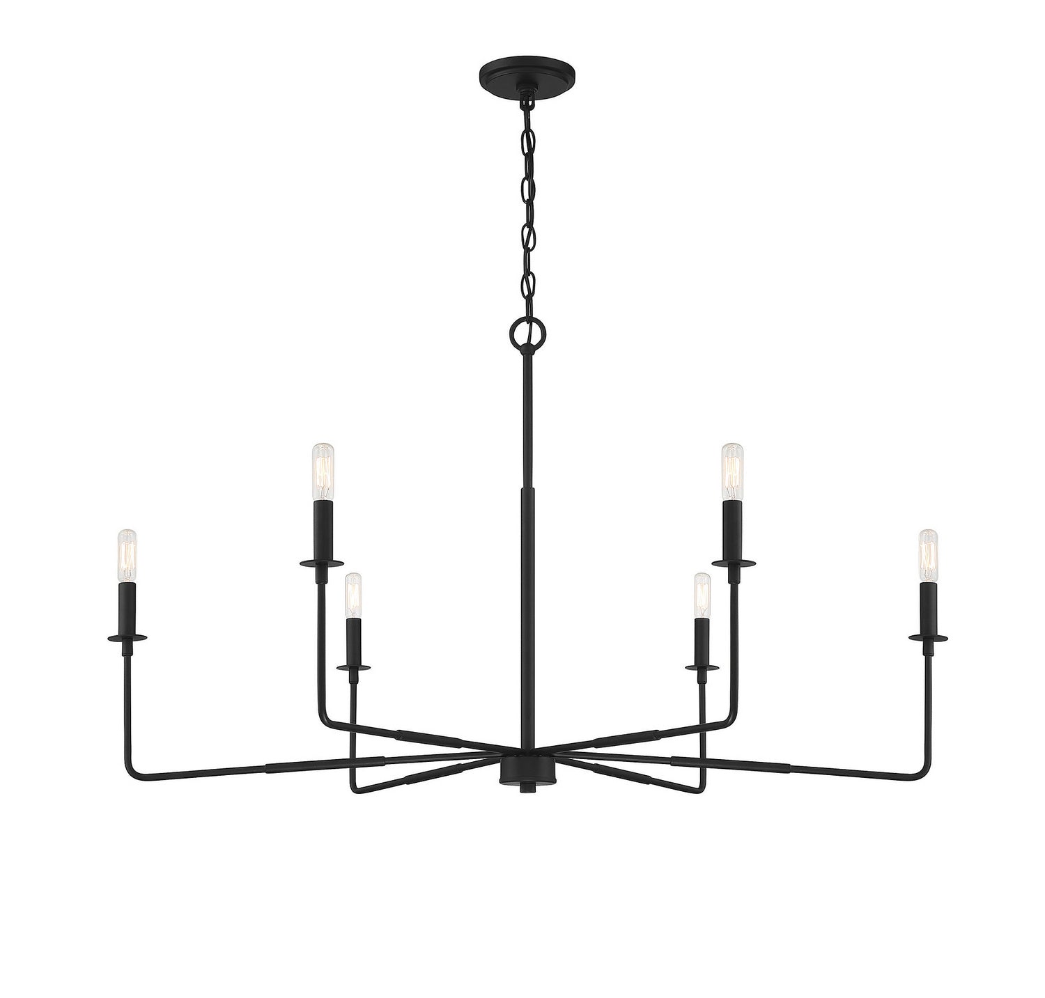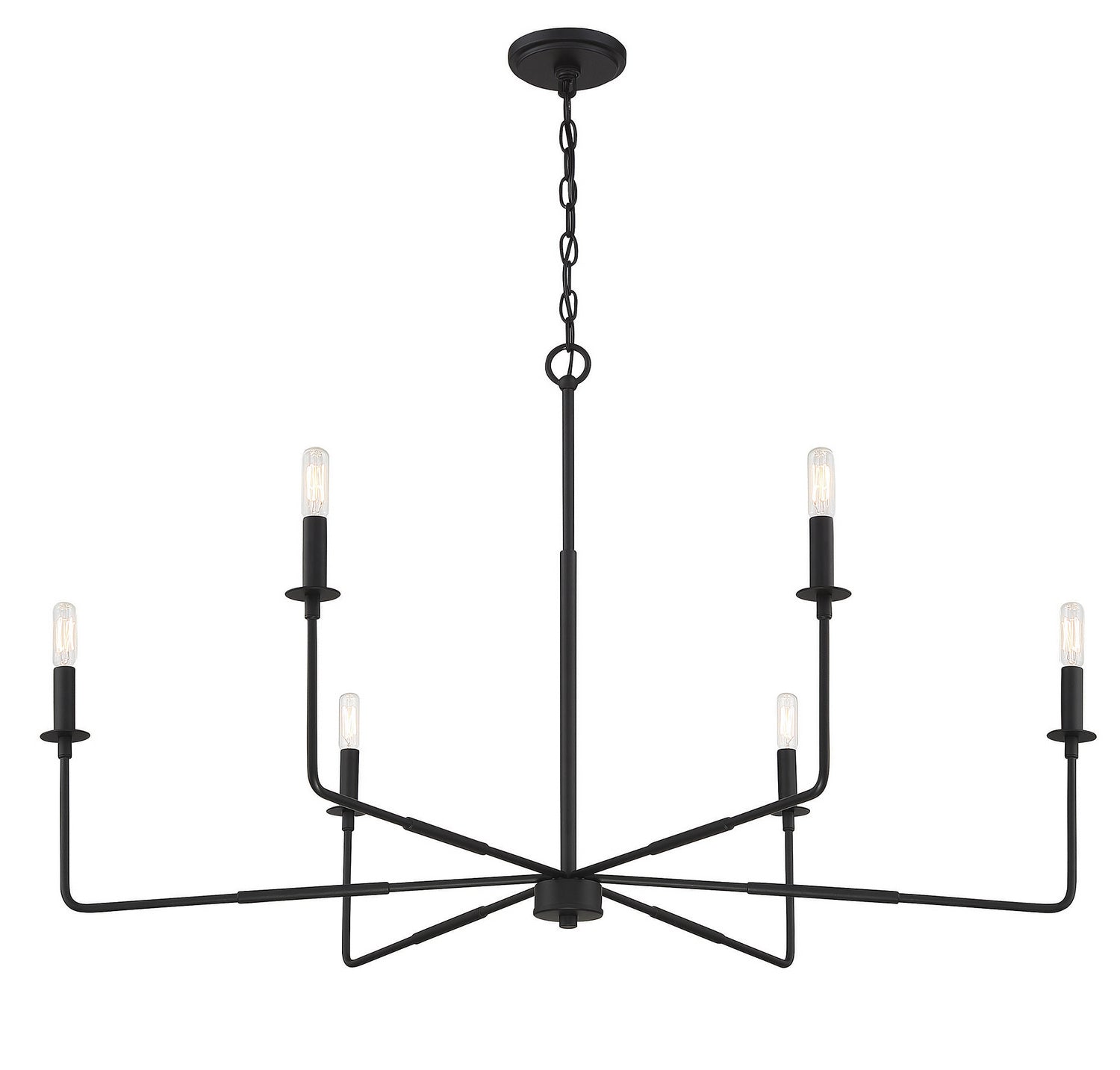 Rustic charm and an expansive reach define the Salerno Collection, which beautifully enhances a large space without taking the attention away from other design elements in the room. Measuring 42" wide x 25" high, the six-light chandelier offers ample illumination from six 60-watt candelabra bulbs. The matte black finish offers a more dramatic touch.