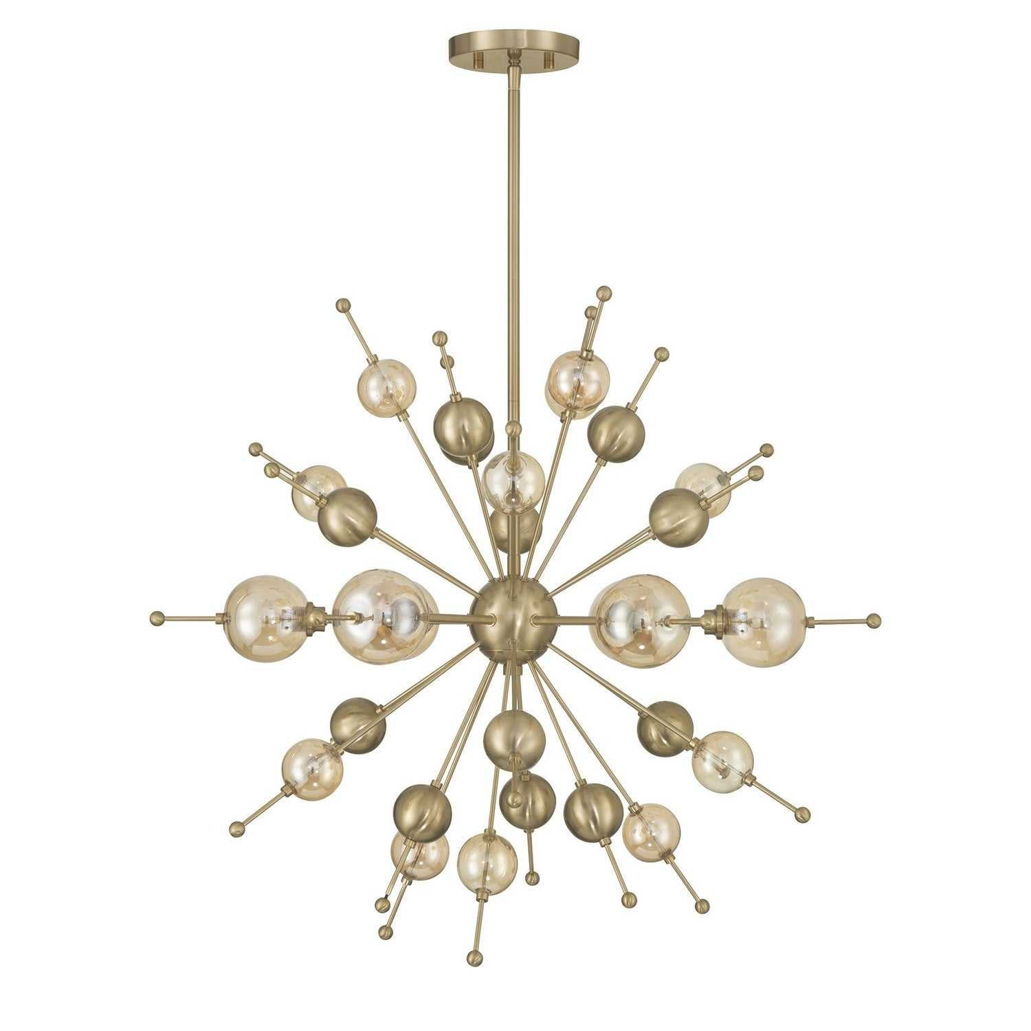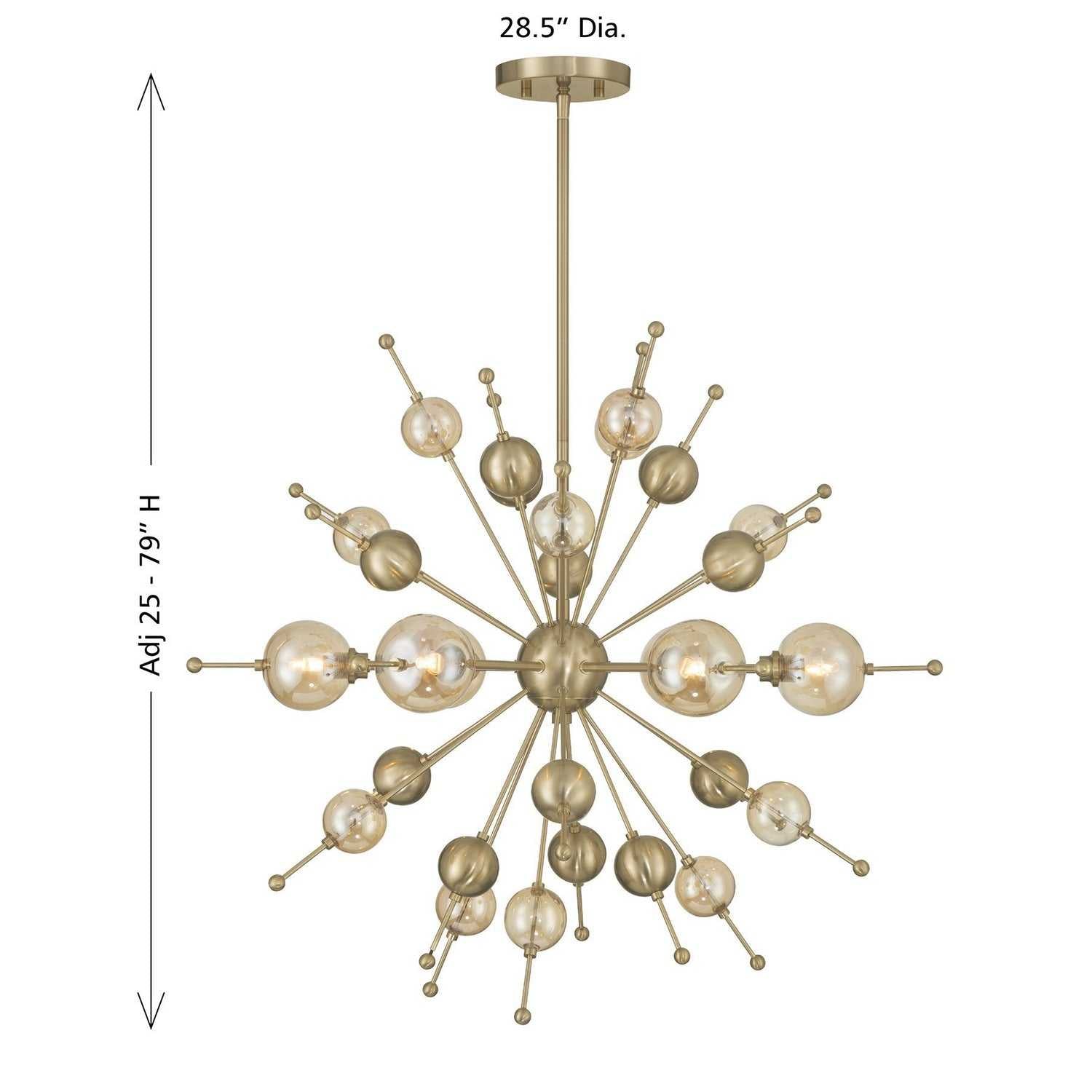 Style bursts forth in the Savoy House Crescent 6-light chandelier, showcasing champagne-hued glass accents on a sleek Sputnik-style frame. The Noble Brass finish heightens the glamour, creating a look that feels celebratory from every angle. Crescent is 28.5" in width and has an adjustable height ranging from 26" to 68". It uses six G9 bulbs of up to 60 watts per bulb. Bulbs not included. Comes with four 12" downrods and one 6" downrod.