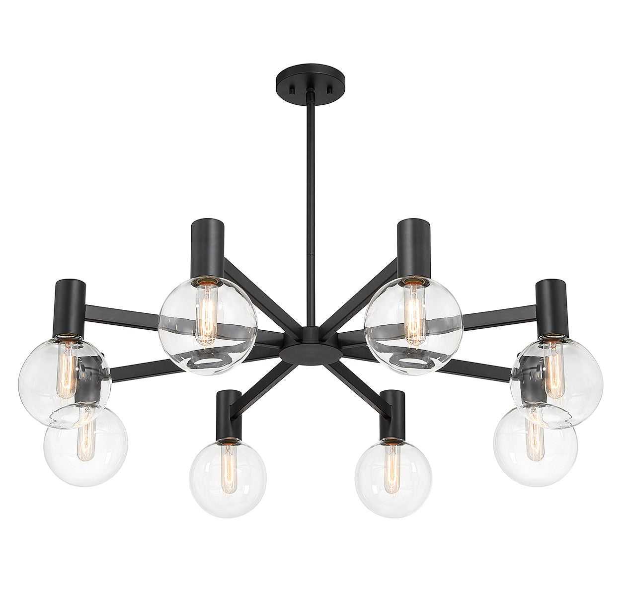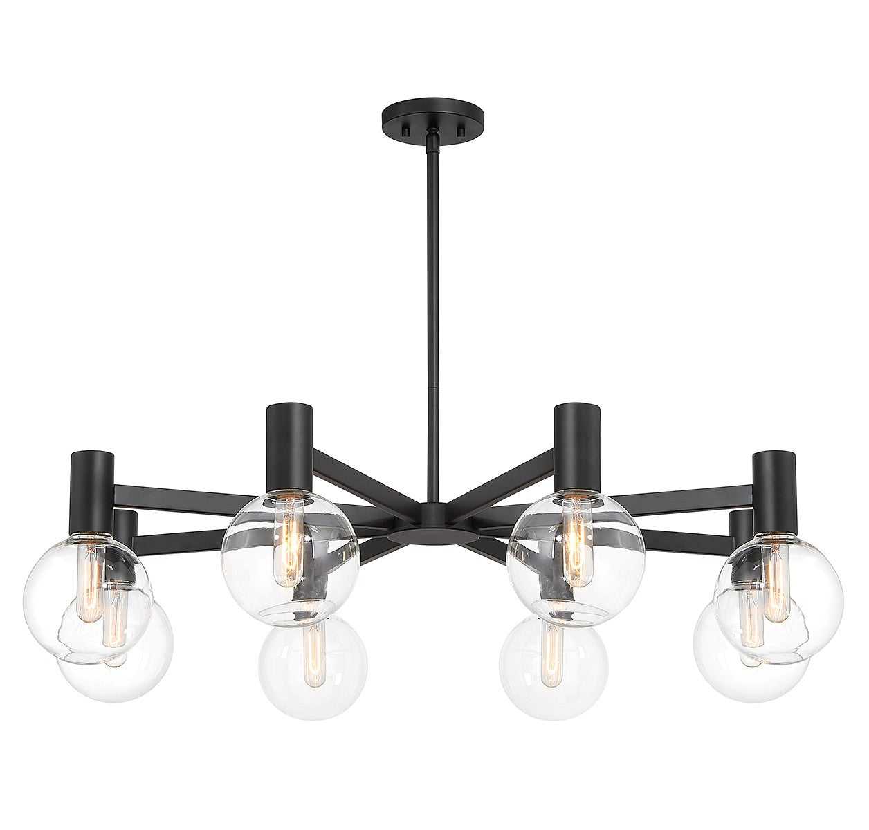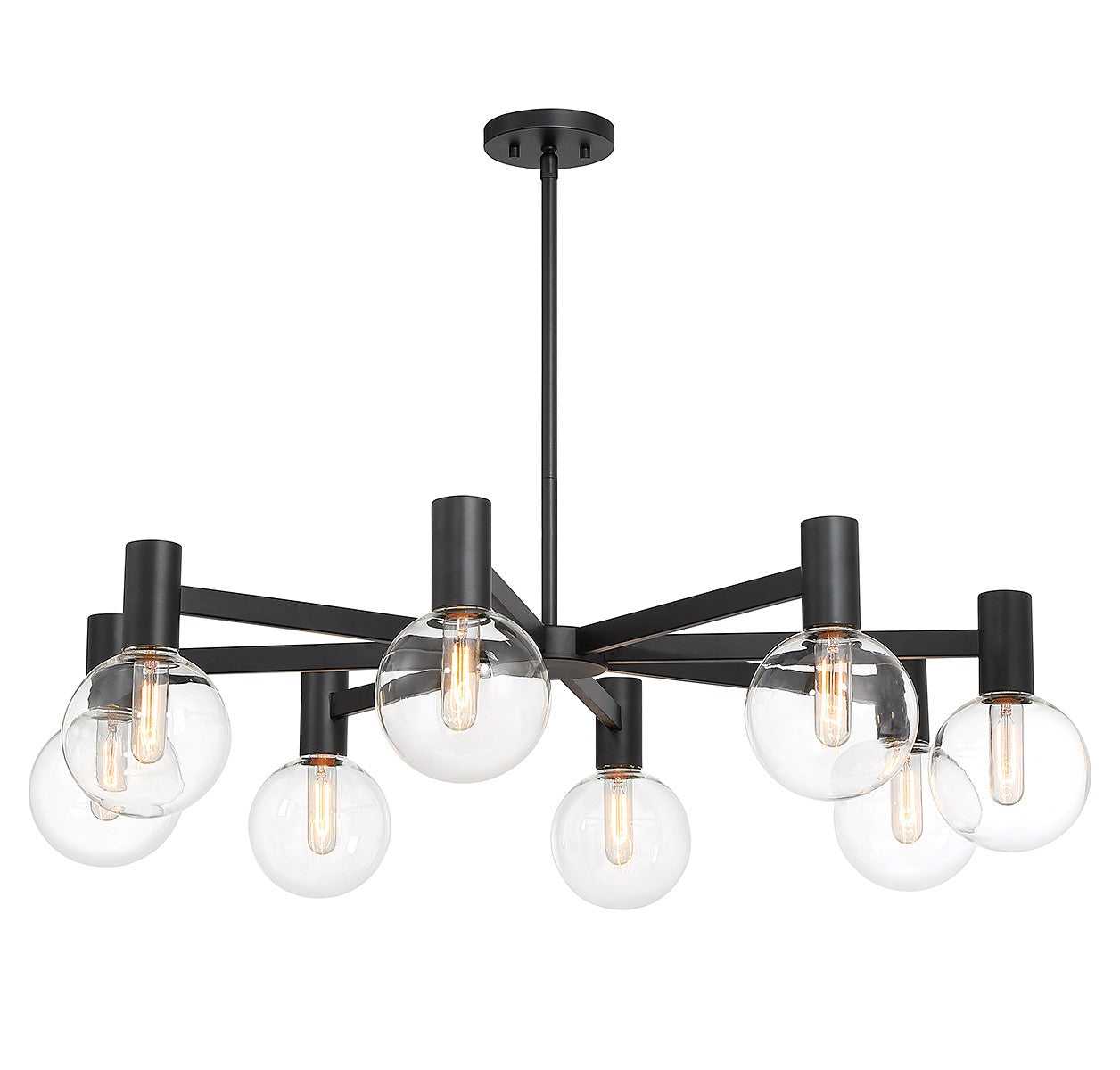 This Savoy House Wright 8-light chandelier showcases large-scale streamlined style that makes it ideal for bigger rooms. Round clear glass shades add an extra dimension and extra protection for the light bulbs within. Matte black finish. Wright is 40" in width and has an adjustable height ranging from 10.5" to 64". Comes with four 12" downrods and one 6" downrod. Uses 8 standard size bulbs of up to 60 watts per bulb (bulbs not included). We recommend using tubular shaped bulbs.