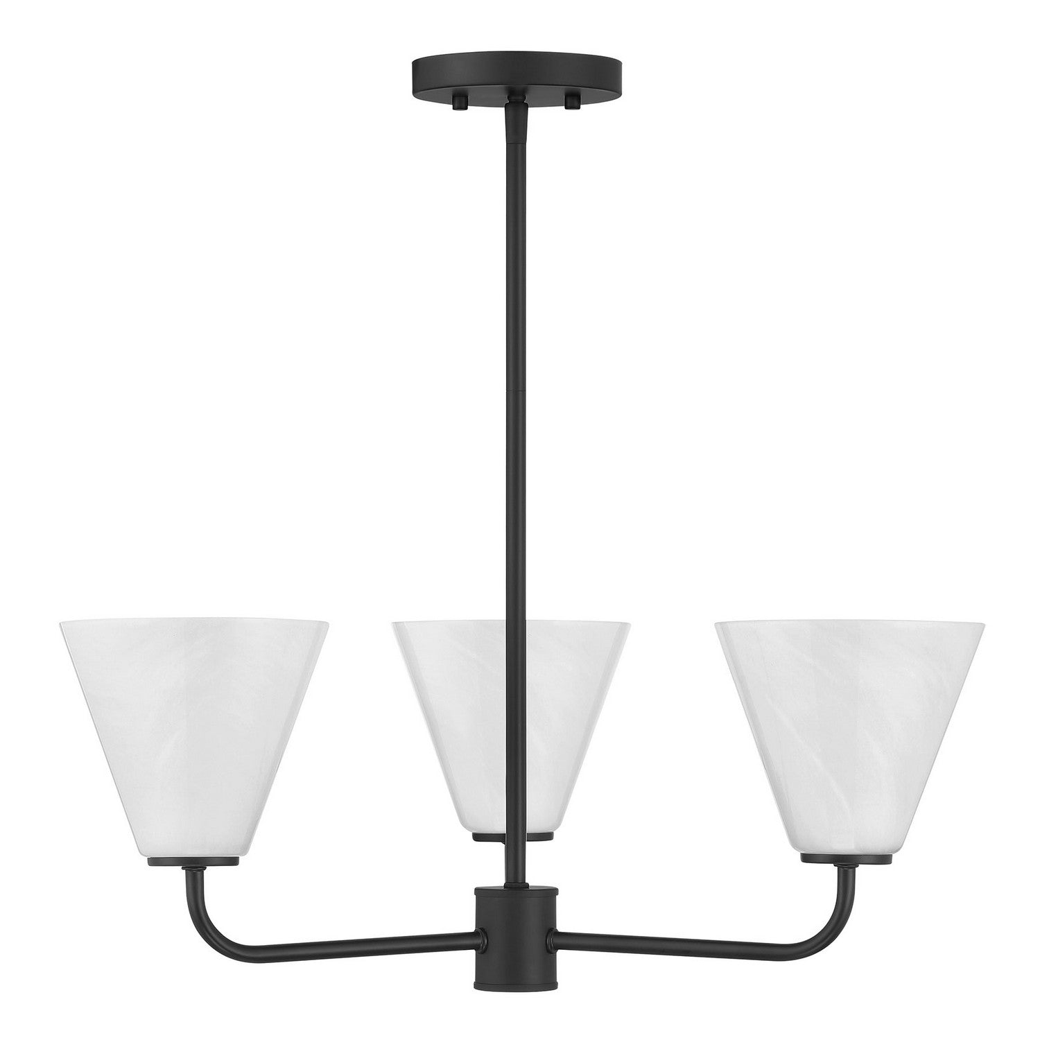 This Savoy House Blair 3-light chandelier is oh so versatile! It can be installed with the lights facing up or down, making it perfect for meeting every lighting need. Slender, sleek arms are finished in Matte Black and topped with shades of spectacularly swirling strie glass. Blair is 24" in width and has an adjustable height ranging from 9" to 63". Uses three standard size bulbs of up to 60 watts per bulb. Bulbs not included. Comes with four 12" downrods and one 6" downrod.
