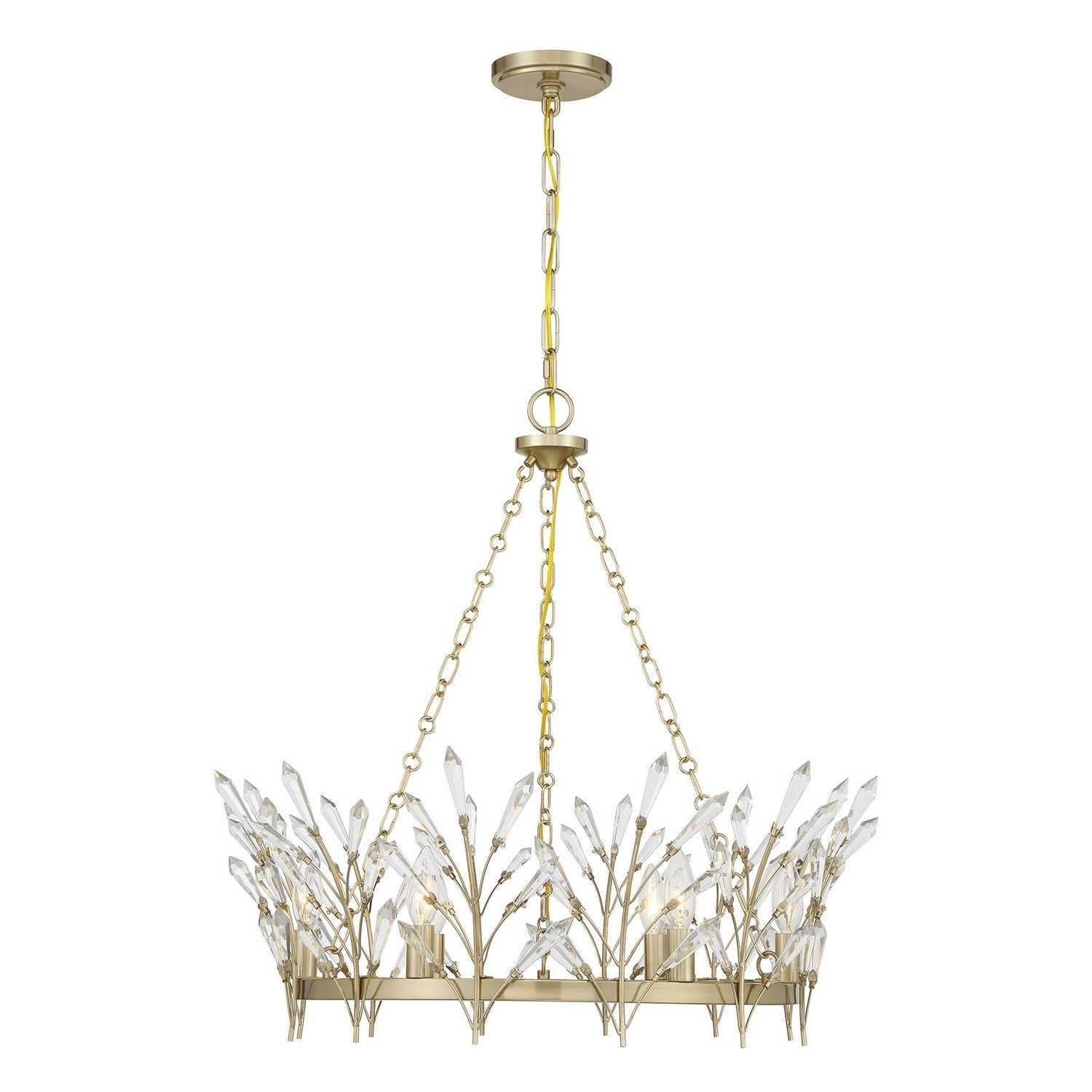 Crown your home with the beautiful tiara that is the Savoy House Orianna 6-light chandelier. Its round, open frame holds slim branches that are adorned with icicle-cut clear crystal accents. They glint and glimmer when illuminated and make a beautiful match with the Noble Brass finish. Orianna is 26" in height and 26" in width. It uses six candelabra size bulbs of up to 60 watts per bulb. Bulbs not included. Comes with 120" of chain.