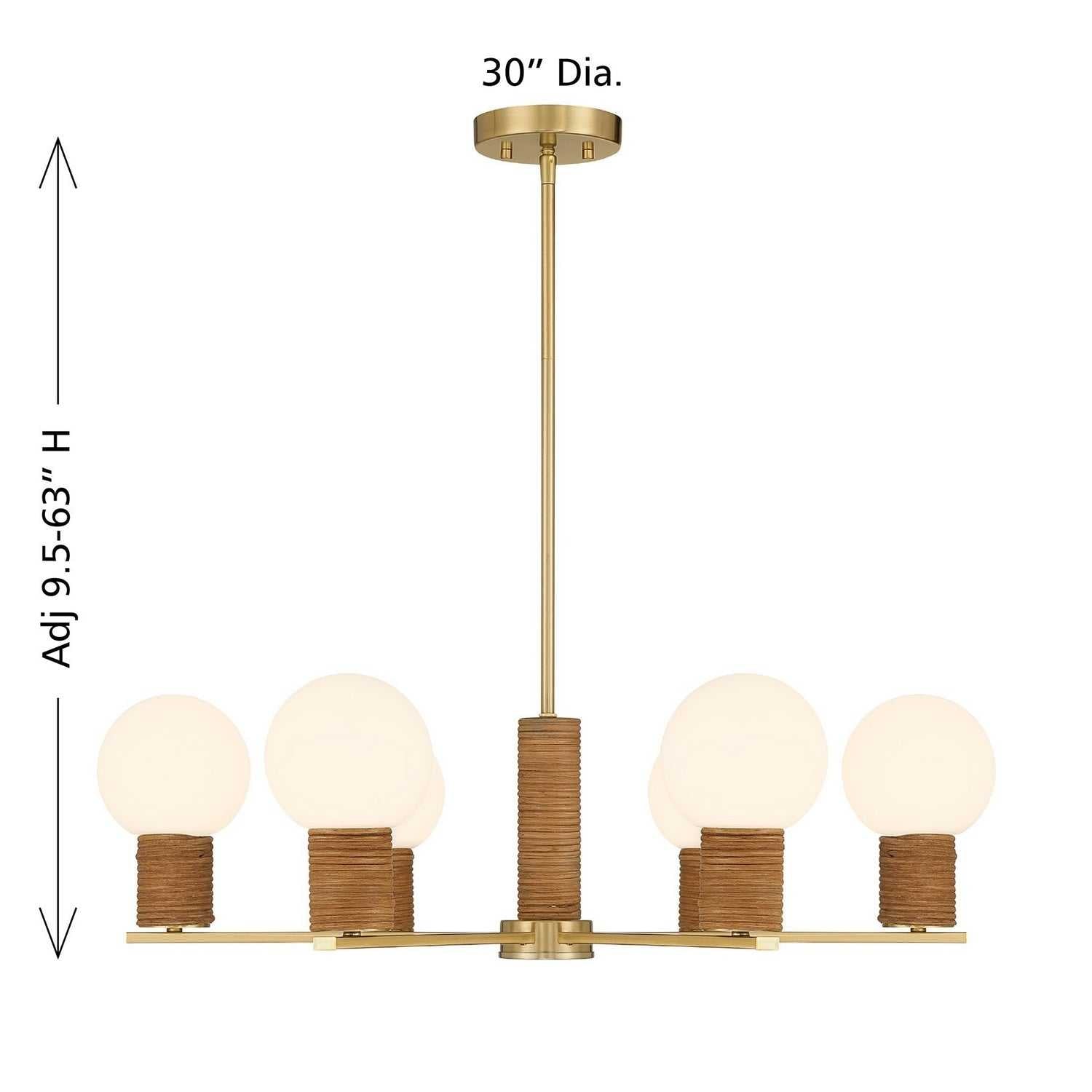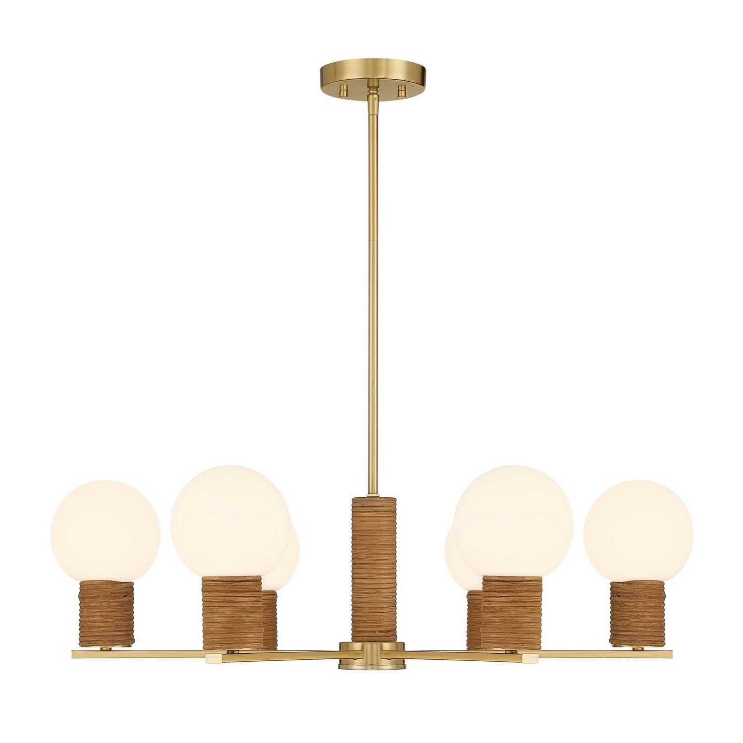 The Savoy House Jarrell 6-light chandelier blends breezy natural materials with a warm, welcoming glow. Natural rattan accents and white opal glass pair effortlessly with the Warm Brass finish, creating a look that feels fresh and inviting. Jarrell is 30" wide and height-adjustable from 9.5" to 63". It uses six candelabra size bulbs of up to 60 watts each (bulbs not included) and includes four 12" downrods and one 6" downrod.