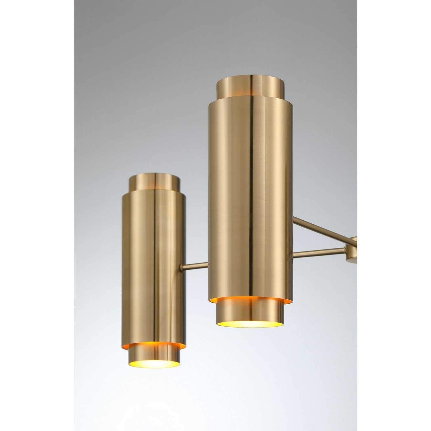 The Savoy House Lio 8-light chandelier is part of Moderne by Breegan Jane, bringing her signature approachable modern luxury style to your home. Breegan loves the timeless, elevating beauty of brass, as seen in this sleek and chic design. Bold solid metal cylinders finished in champagne-toned Noble Brass hold lights that shine out above and below to create a concentrated and dramatic lighting look. Lio is 31" in width and has an adjustable height ranging from 11.5" to 65.5". Comes with four 12" downrods and one 6" downrod. Uses eight candelabra size bulbs of up to 60 watts per bulb. Bulbs not included.