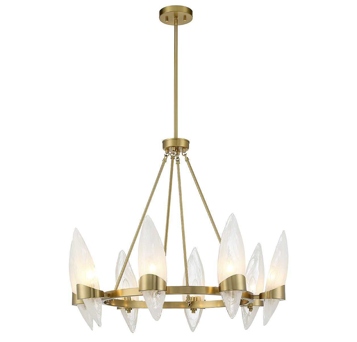 With its petals of handmade strie glass and warm brass finish, the Savoy House Nouvel 8-light chandelier blossoms like a gorgeous Art Deco-meets-contemporary flower. It will create a stunning focal point in any space. Nouvel is 31" in diameter and has an adjustable height ranging from 27.5" to 81". Comes with four 12" downrods and one 6" downrod. It uses 8 candelabra size bulbs of up to 60 watts per bulb (bulbs not included).