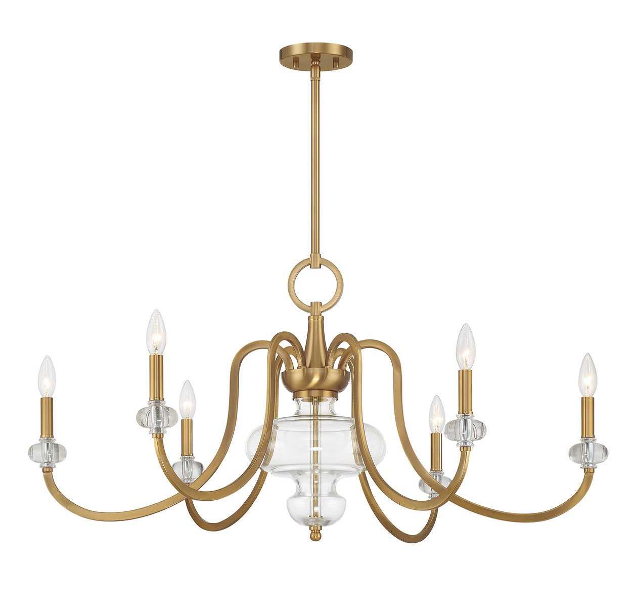 The Savoy House Bergdorf 6-light chandelier is a beautiful way to impart any room with New Traditional style. Dramatically curving arms are finished in Warm Brass and decorated with glass bobeches that match the beautifully molded clear glass detail on the center column. Bergdorf is 39" in width and has an adjustable height ranging from 19" to 73". Comes with four 12" downrods and one 6" downrod. Uses six candelabra size bulbs of up to 60 watts per bulb. Bulbs not included.