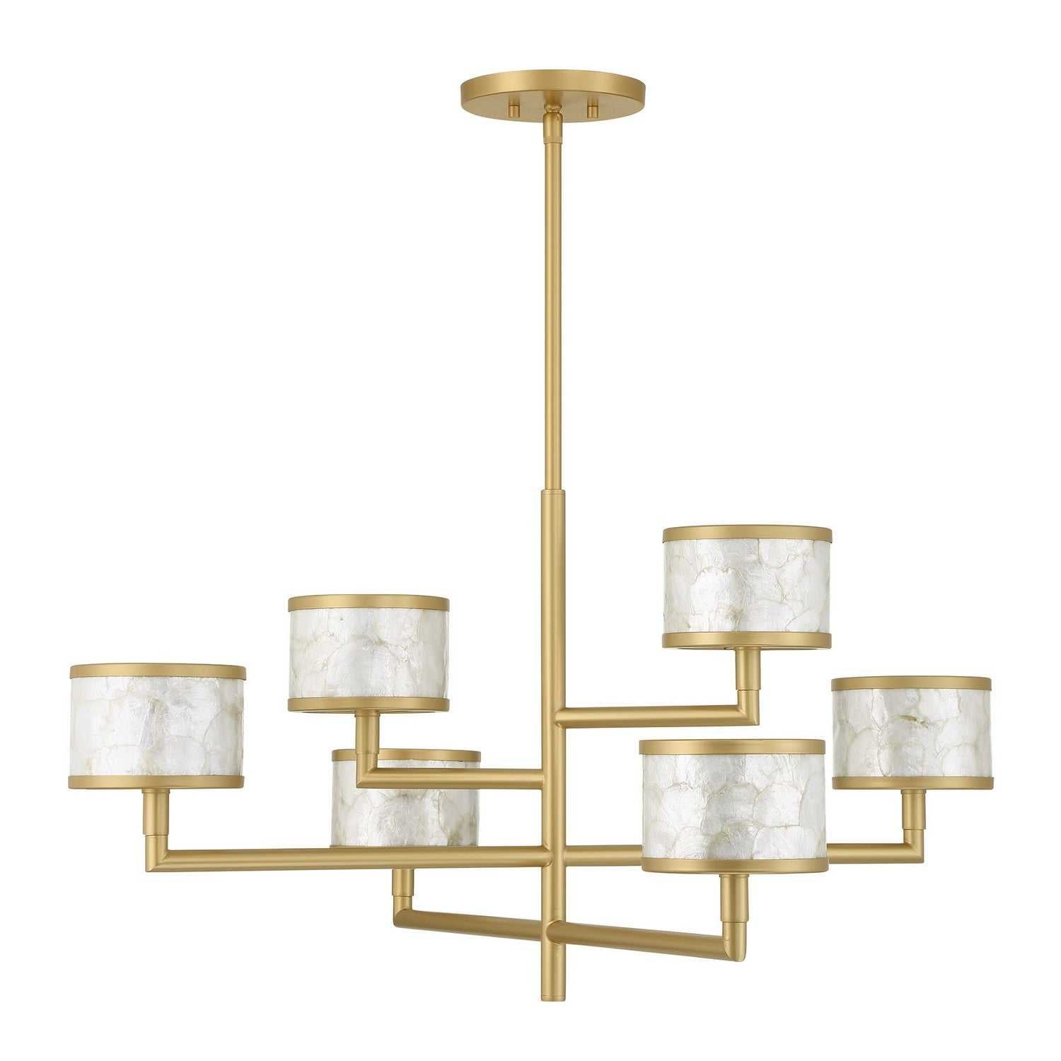 Add a burst of shimmering seaside style to any space with the eye-catching Savoy House Mariquita 6-light chandelier, designed by award-winning interior designer and TV host Breegan Jane. This collection is named for her grandmother and puts elegance on full display. Shades are decorated with natural shell accents that add bright texture, and the chandelier has a geometric configuration that brings sophistication. The combination of the Spun Gold finish and the white from the shells is sure to wow. Mariquita is 34" in width and has an adjustable height ranging from 17.5" to 71.5". It uses six candelabra size bulbs of up to 60 watts per bulb. Bulbs not included. Comes with four 12" downrods and one 6" downrod.