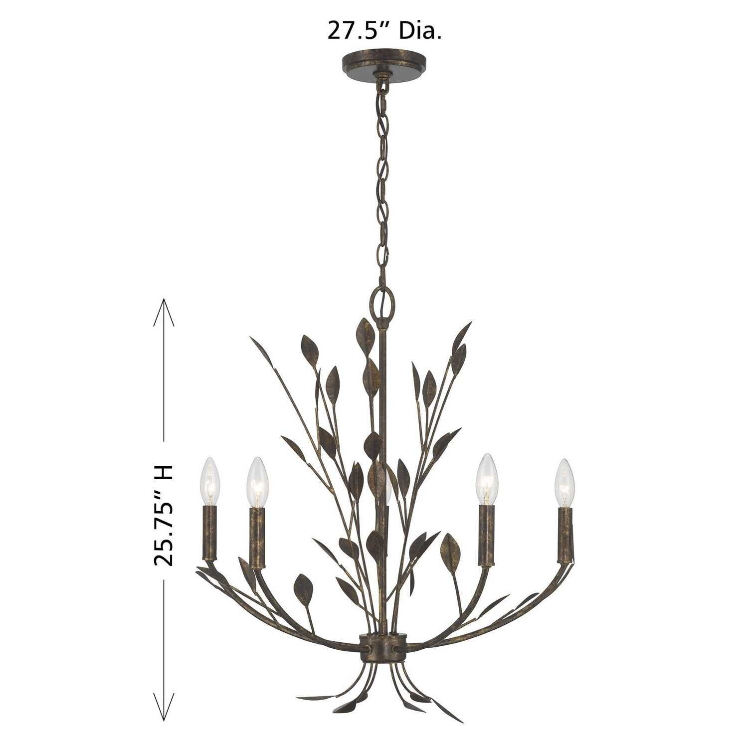 The Savoy House Laska 5-light chandelier, created in collaboration with award-winning interior designer and TV host Breegan Jane, celebrates nature's sculptural beauty. Slim, gracefully branching arms are adorned with delicate leaf details, all finished in hand-painted Enchanted Bronze for a luminous, artisanal look. Laska is 25.5" high and 24" wide. It uses five candelabra size bulbs of up to 60 watts per bulb. Bulbs not included. Comes with 120" of hanging chain.