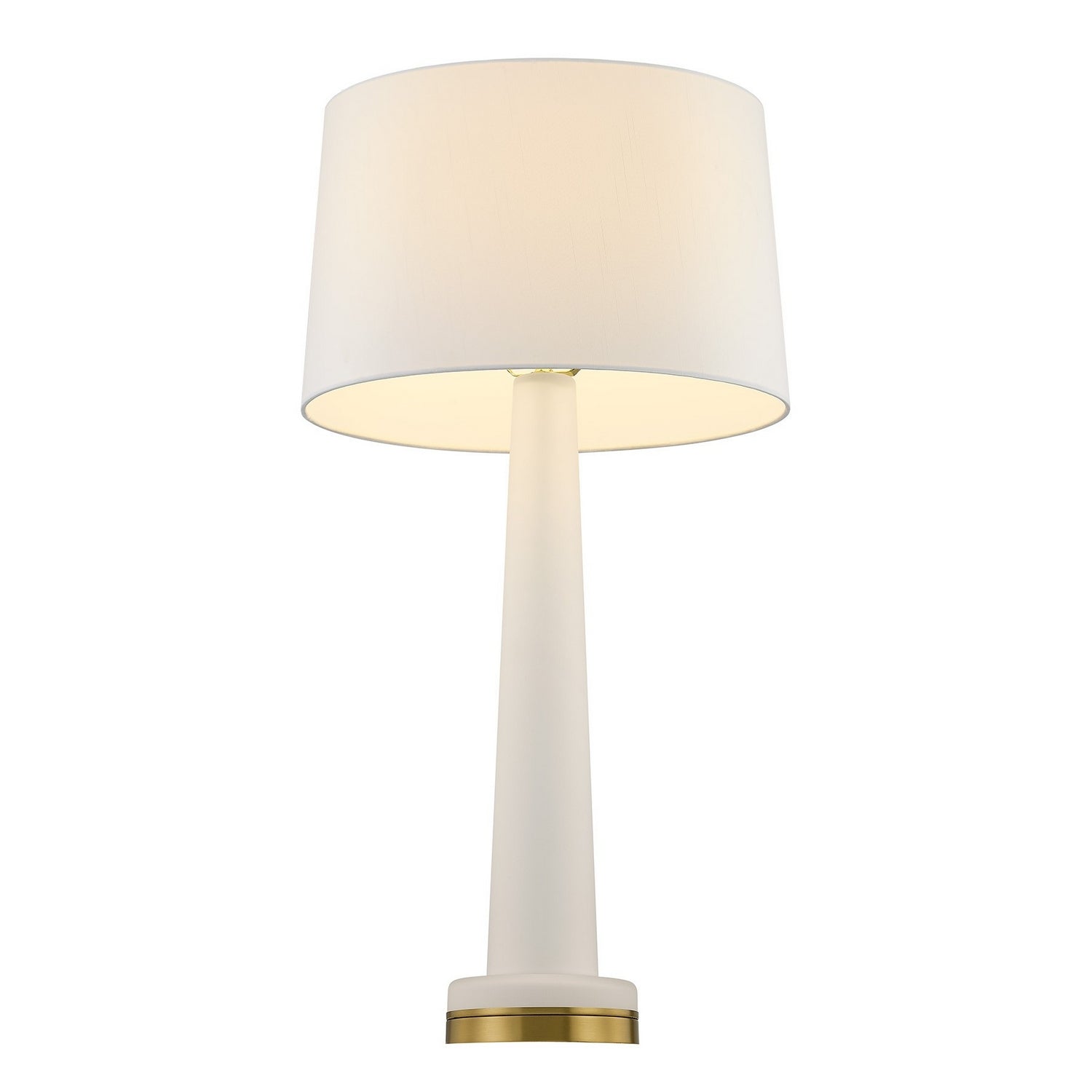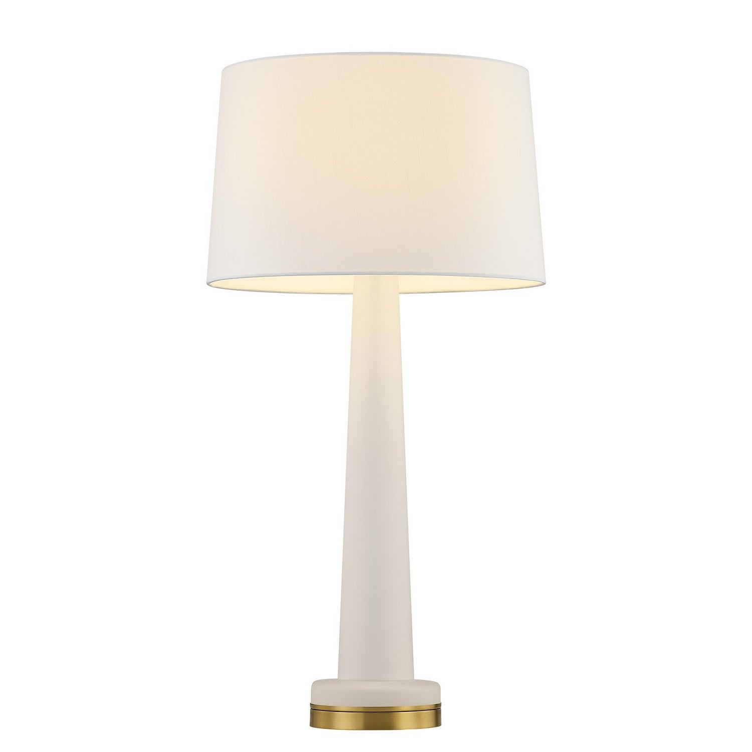 The Savoy House Trenton 1-light table lamp was designed by Dann Foley, an award-winning interior designer known for elevated, timeless taste. Its frosted glass body, white fabric shade and Warm Brass finish come together to create a classic, graceful silhouette that suits a wide range of interiors. Trenton is 30.75" in height and 16" in width. It uses one standard size bulb of up to 100 watts. Bulb not included.