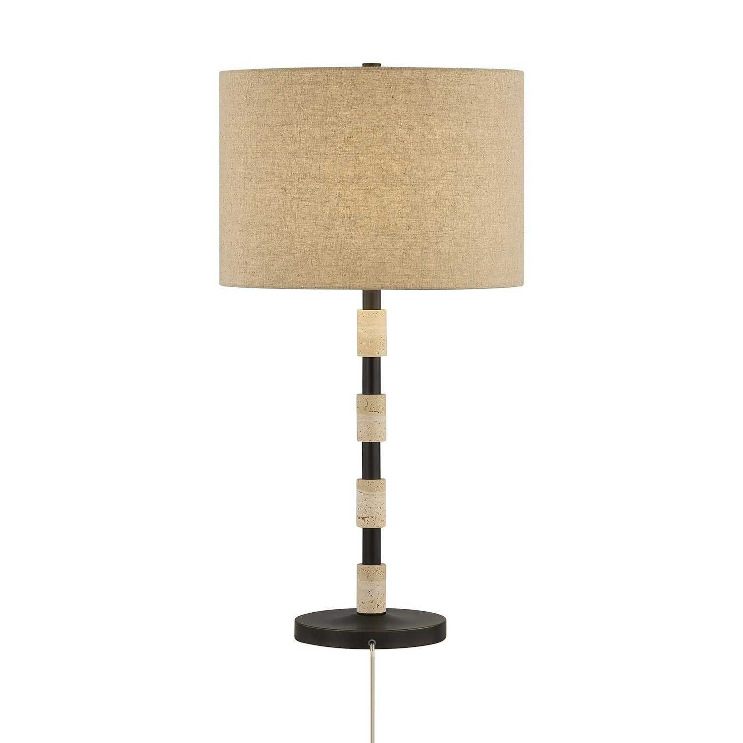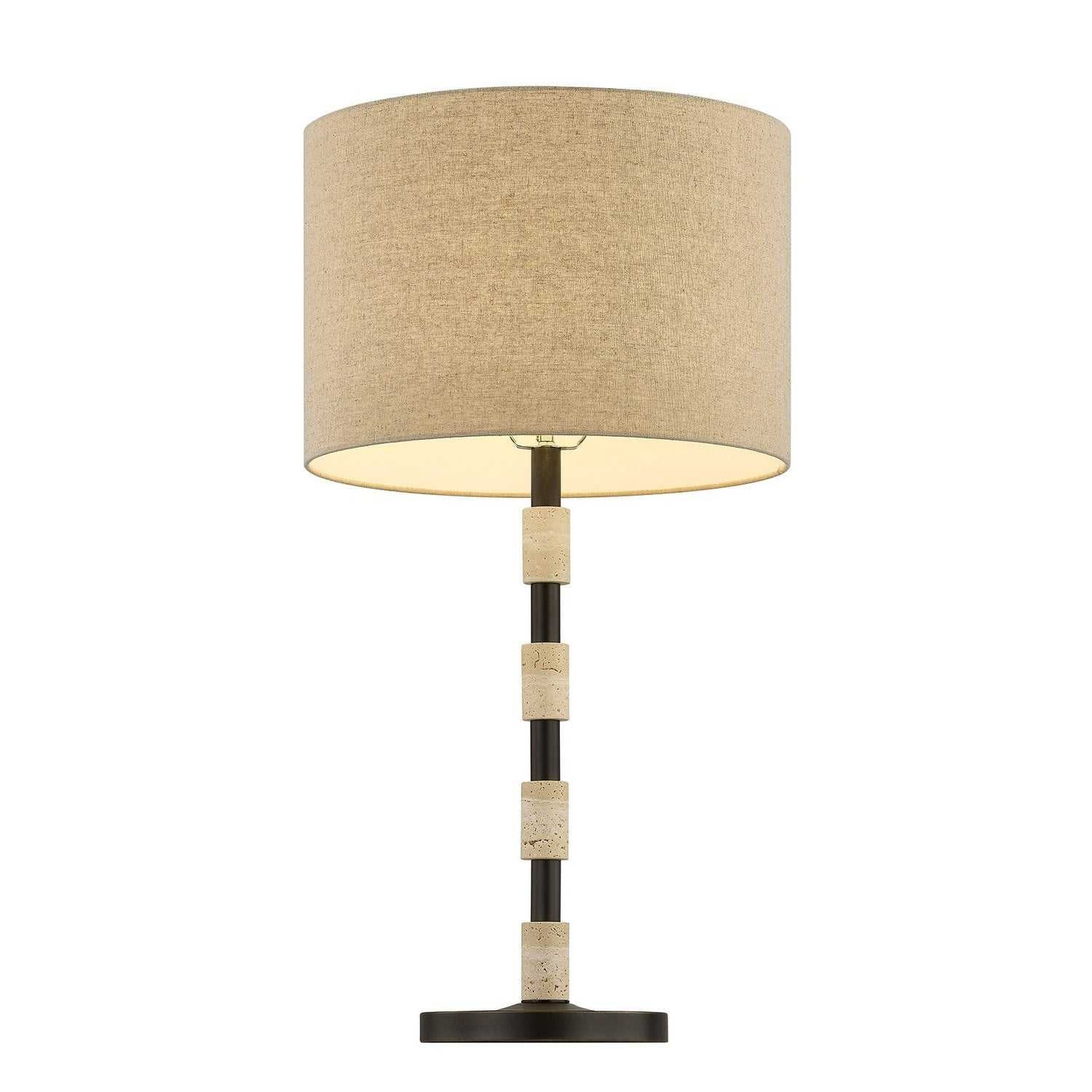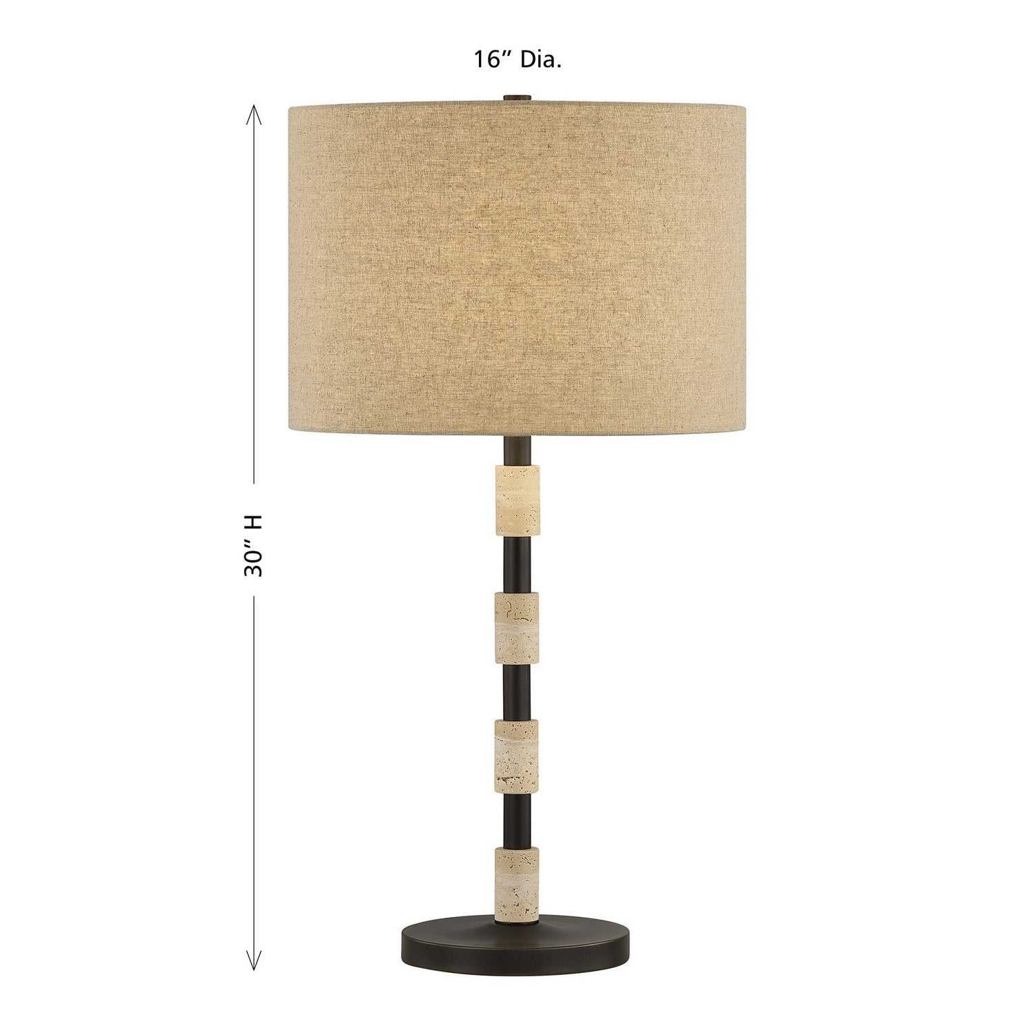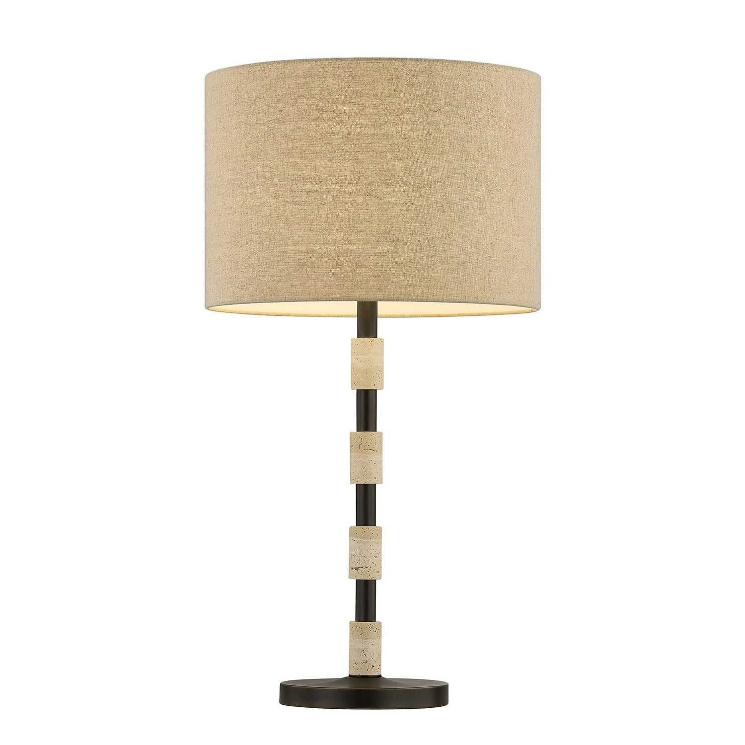 The Savoy House Dothan 1-light table lamp brings a grounded sense of warmth to any space through a design by award-winning designer Dann Foley. Its streamlined silhouette is accented with light travertine details, each naturally marked with tiny voids that celebrate the beauty of the earth's artistry. A sand-toned fabric shade softens the Mediterranean Bronze finish, creating a look that glows with organic elegance. Dothan is 30" in height and 16" in width. It uses one standard size bulb of up to 100 watts. Bulb not included.