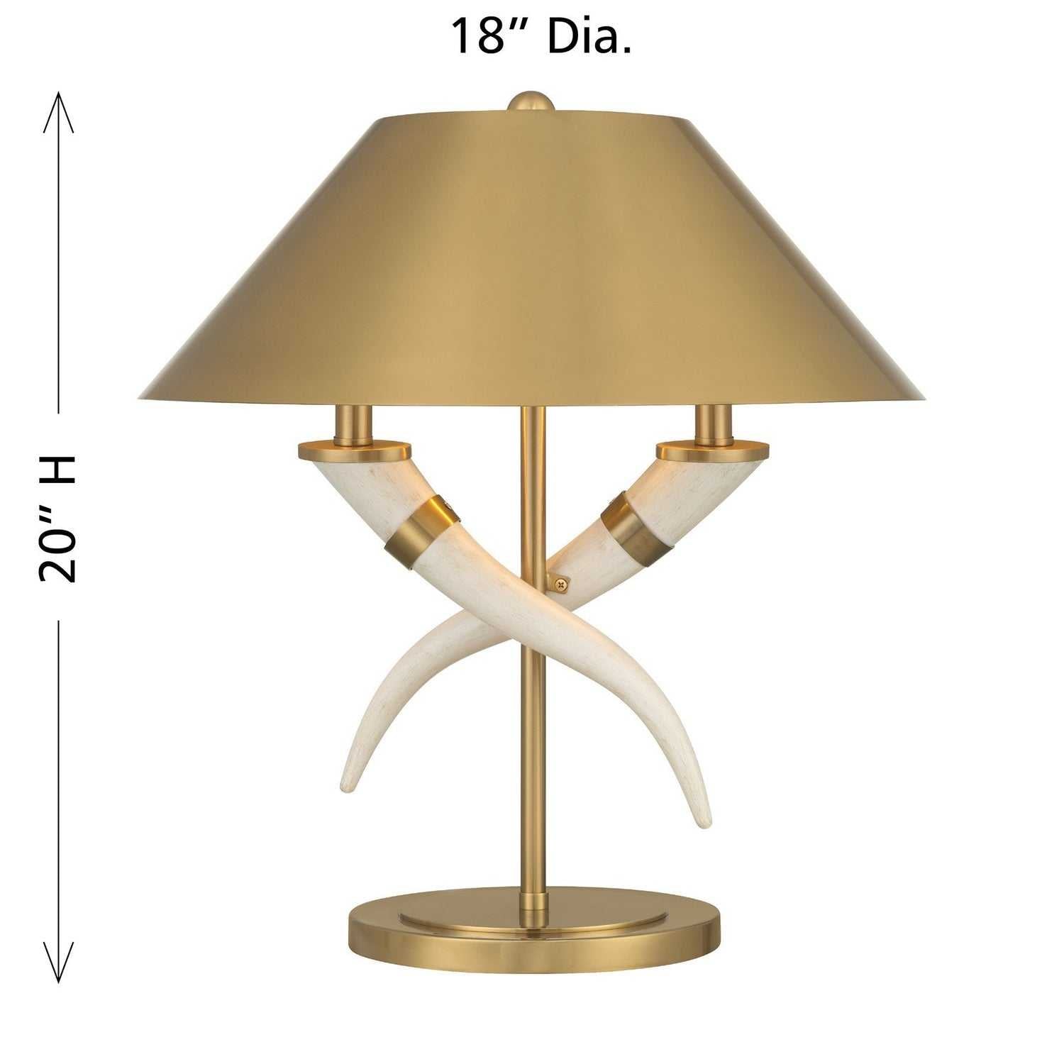 With the Savoy House Hearne 2-light table lamp, award-winning interior designer Dann Foley brings his signature sculptural glamour to the tabletop. Intertwined curved horns meet beneath metal shades that direct light with precision, producing a look that feels both bold and organic. The Warm Brass finish delivers an inviting glow. Hearne stands 20" tall and 18" wide. Uses two candelabra size bulbs of up to 60 watts per bulb (not included).
