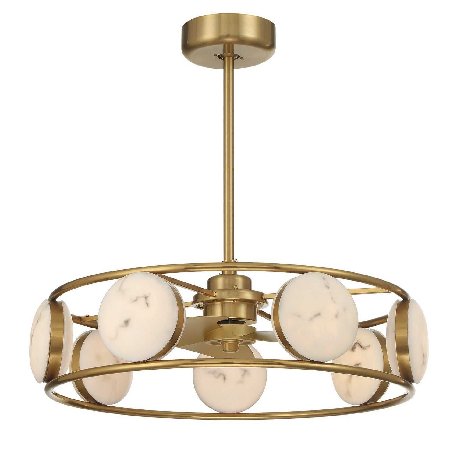 Add a luxe, jewelry-inspired statement to your home with the Savoy House Castra Fan D'Lier. Glowing realistic faux alabaster disks bring soft texture and dimension, balanced by an open frame finished in glowing Warm Brass. The integrated LED ensures bright, even lighting and the DC motor enhances efficiency. A handheld remote and 4" and 18" downrods are included. Castra is 29" in height and 30" in width. As part of the Savoy House Fan D'Lier collection, it unites the artistry of a chandelier with the refreshing comfort of a ceiling fan to create an inspired combination of texture, style, and function.