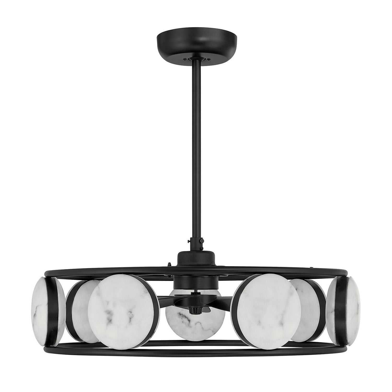 Elevate any room with the refined drama of the Savoy House Castra Fan D'Lier, where modern minimalism meets the glow of realistic faux alabaster. Disk-shaped accents with detailed veining surround an open, airy frame finished in timeless Matte Black. Integrated LED illumination shines beautifully while the efficient DC motor delivers quiet comfort. A handheld remote, plus 4" and 18" downrods, are included. Castra stands 29" tall and 30" wide. Fan D'Liers are a Savoy House exclusive that reimagines cooling and lighting in one fashionable form.