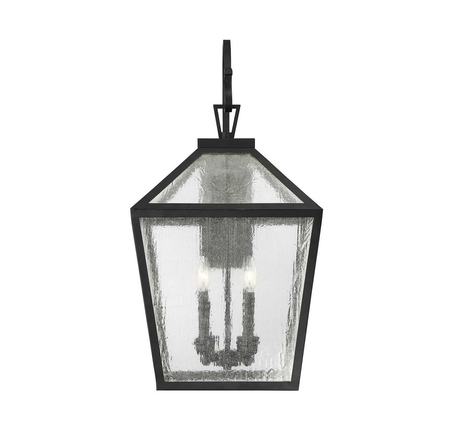 The traditional charm of vintage lanterns blends beautifully with streamlined, contemporary appeal in this Savoy House Woodstock 4-light outdoor wall lantern. Everyone who enters your home will feel welcomed and appreciate its classic style. Finished in matte black with clear seeded glass panes that add wonderful textural interest. The 30.5" high by 15" wide size makes it easy to place multiples of these lanterns on the walls of your porch, patio, sunroom, garage or pergola. Uses 4 candelabra size bulbs of up to 60 watts each. Wet area rated.