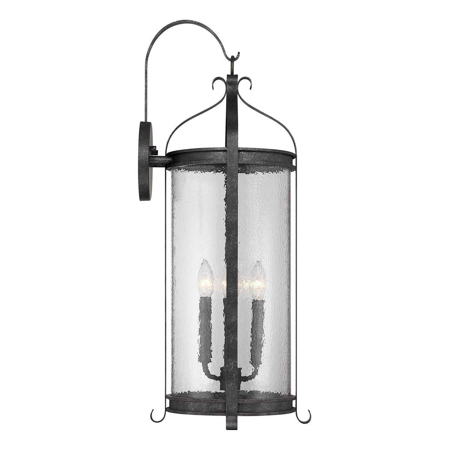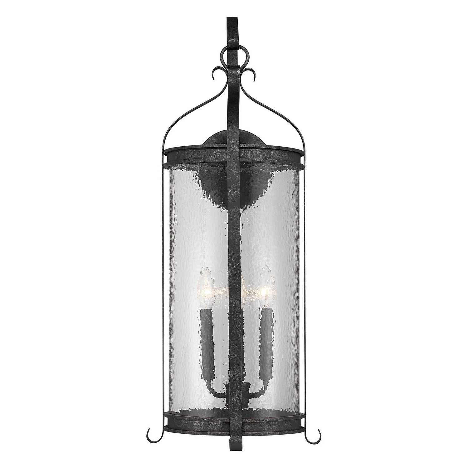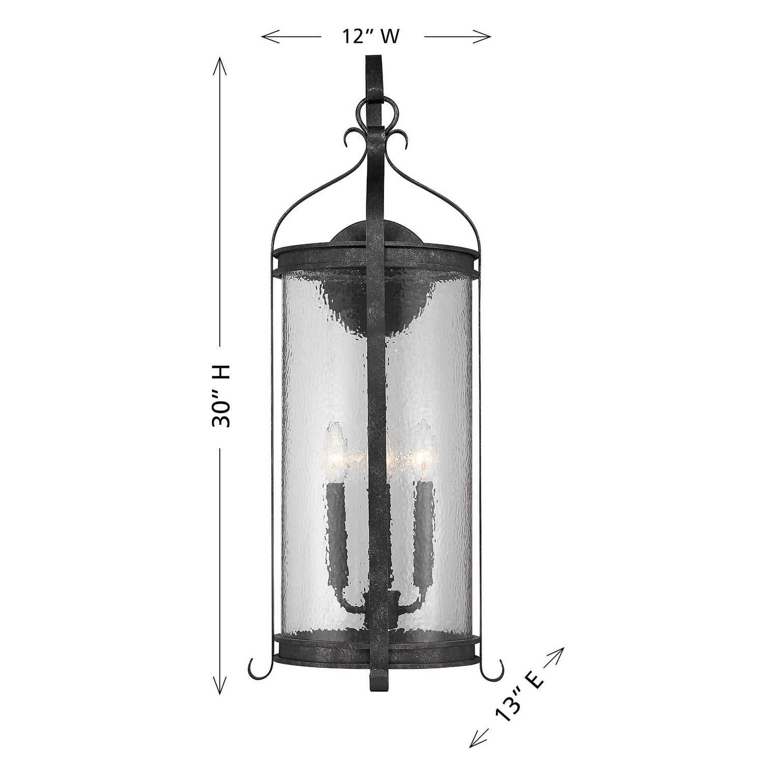 The Savoy House Preston 4-light outdoor wall sconce pairs dramatic height with enduring traditional style. Clear pebbled glass panels shimmer within an elongated frame while decorative flourishes, including the signature shepherd's hook, add classic charm. The Iron Oxide finish, with its distressed detailing, deepens the visual warmth. Preston stands 30" tall, 12" wide, and extends 13" from the wall. Uses four candelabra size bulbs of up to 60 watts each (bulbs not included). Wet area rated.