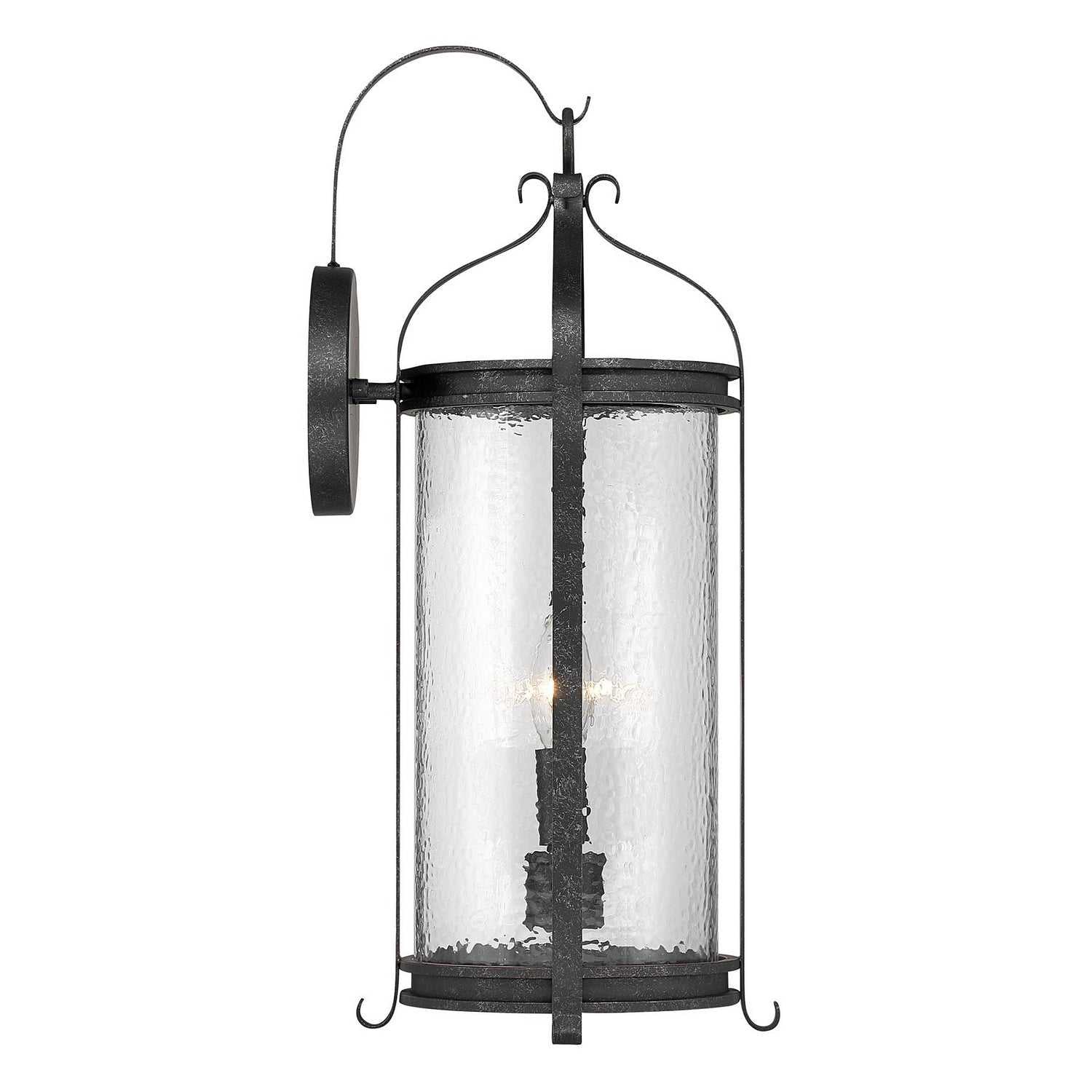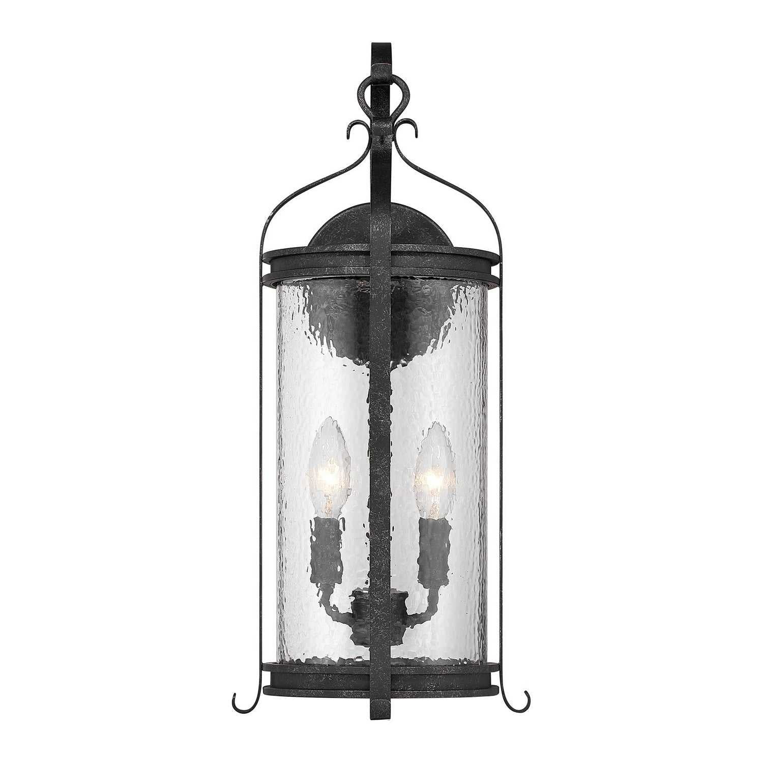The Savoy House Preston 2-light outdoor wall sconce blends traditional form with textural nuance. Panes of clear pebbled glass shimmer inside an elongated silhouette adorned with graceful detailing, including a shepherd's hook accent. The distressed Iron Oxide finish adds dimension and character. Preston is 20" tall, 8.63" wide, and extends 9.5" from the wall. Uses two candelabra size bulbs of up to 60 watts each (bulbs not included). Wet area rated.