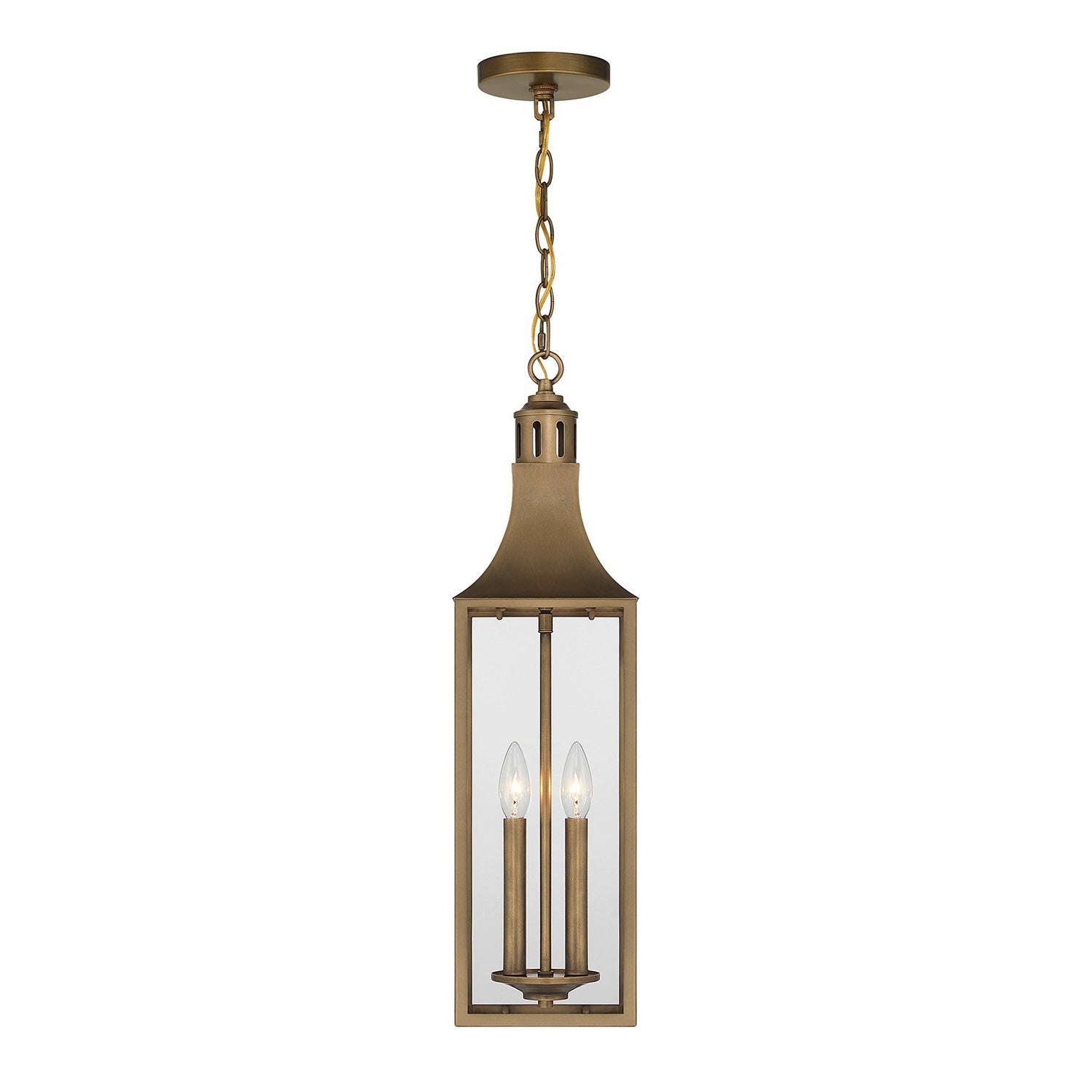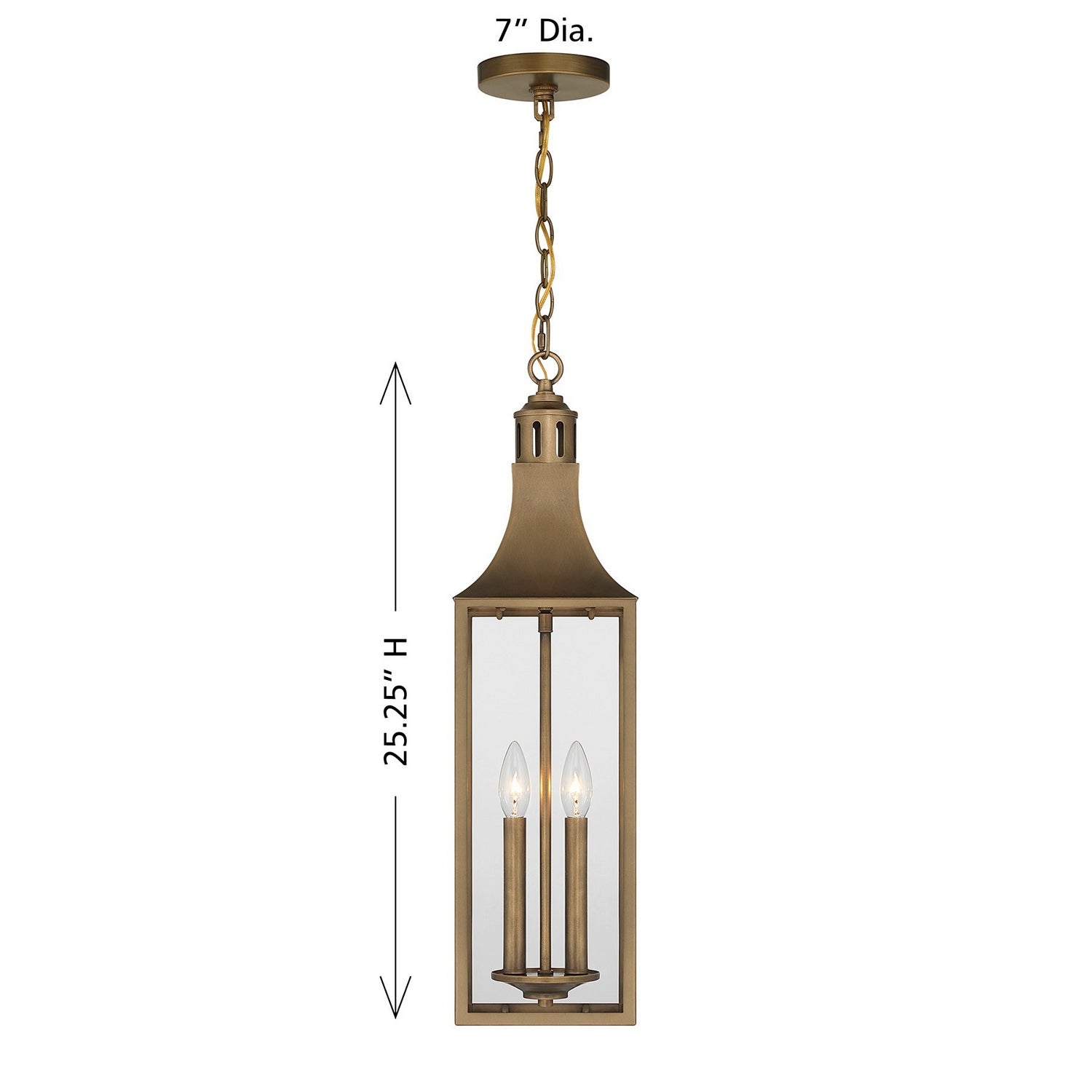 Light the way home with the refined, classic presence of the Savoy House Lancaster 2-light outdoor hanging lantern. Its elongated silhouette, gently arched rooftop, and chimney detail create a look rooted in traditional charm. Clear glass panels showcase a welcoming wash of light while the Atlas Bronze finish brings warmth and depth. Perfect for covered porches and entries, this pendant stands at 25.25" high and 7" wide. Uses two candelabra bulbs of up to 60 watts each (not included). Includes 120" of chain. Damp area rated.