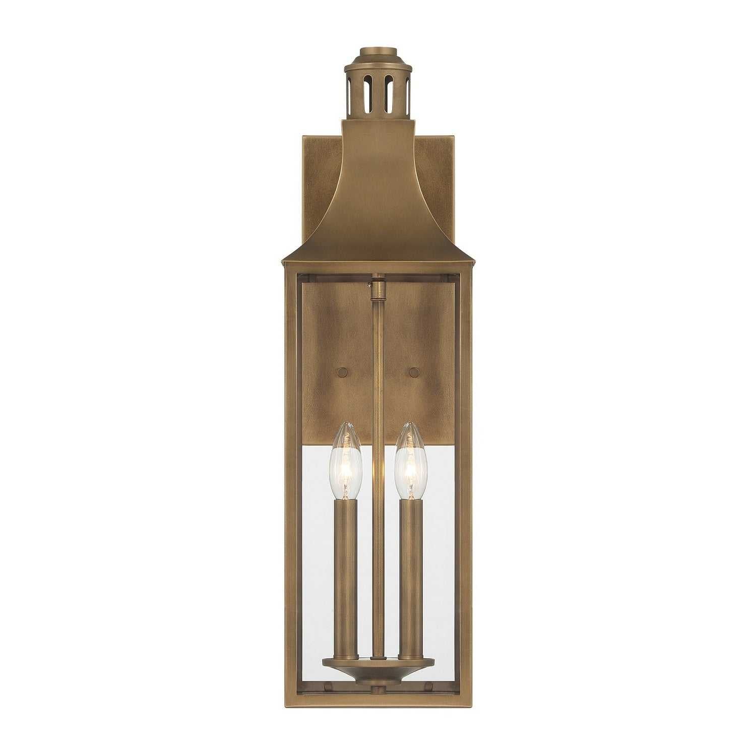 Bring timeless elegance to your home's exterior with the Savoy House Lancaster 2-light outdoor wall lantern. The collection's tall, poised profile and vintage-inspired roofline amplify curb appeal while clear glass ensures bright, radiant illumination. Its Atlas Bronze finish enriches the design with warmth and a classic sense of place. Lancaster measures 23.5" tall, 7" wide, and extends 9.25" from the wall. Uses two candelabra bulbs of up to 60 watts each (not included). Wet area rated.