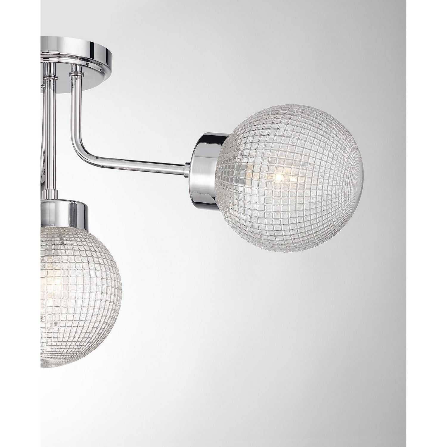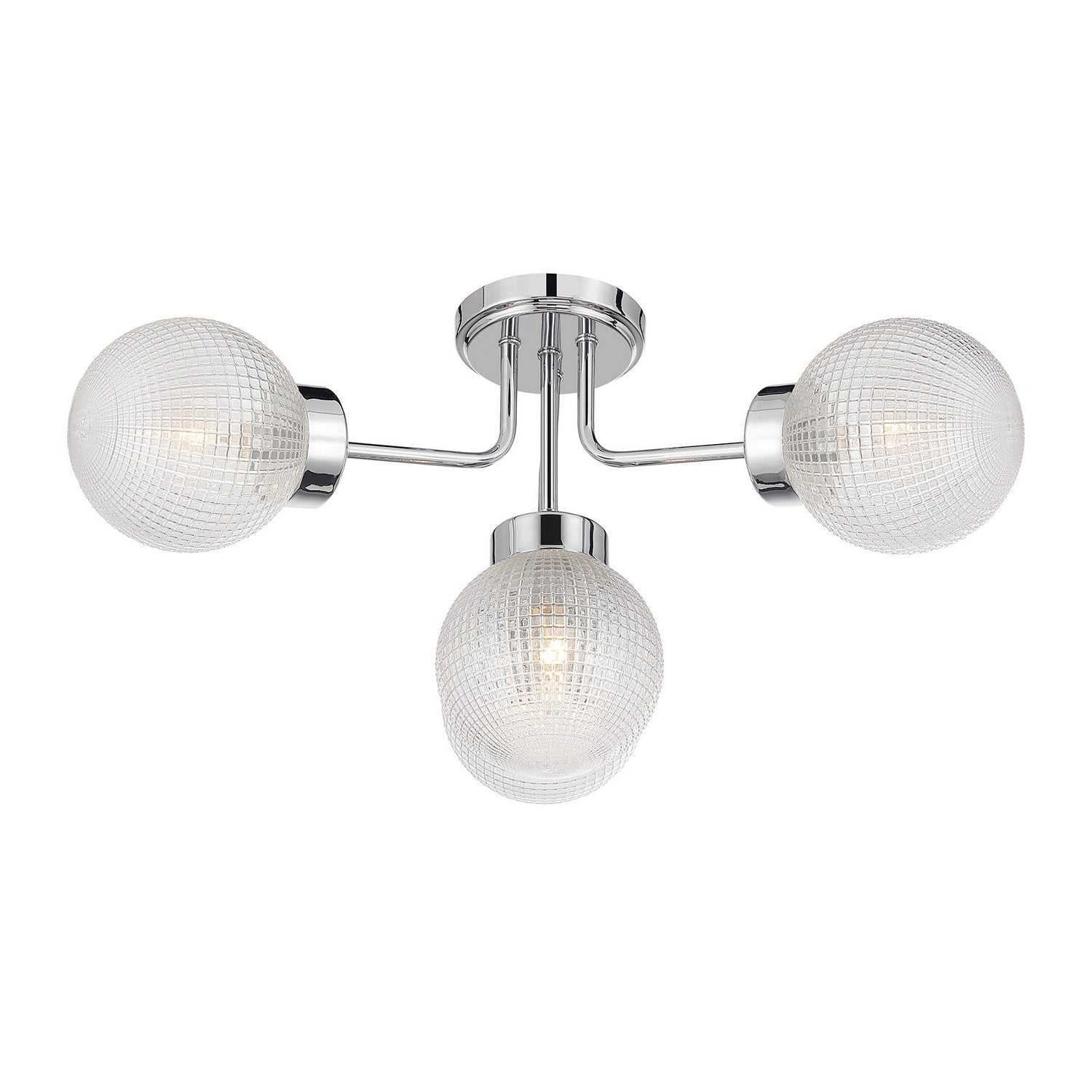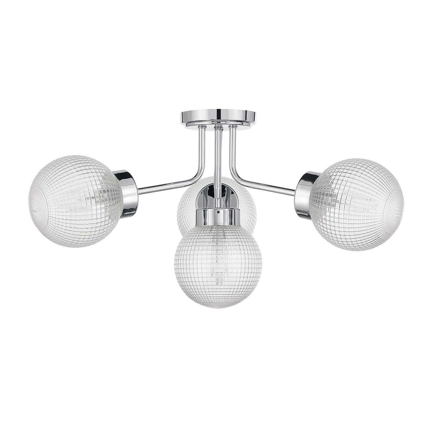 The Savoy House Coral 4-light semi-flush mount brings a crisp, polished look to contemporary spaces. Its graceful curved arms hold shimmering orbs of textured clear matrix glass while the Chrome finish adds refined brightness with a clean, modern edge. Coral measures 13" high and 27" wide. It uses four candelabra size bulbs of up to 60 watts each (not included).