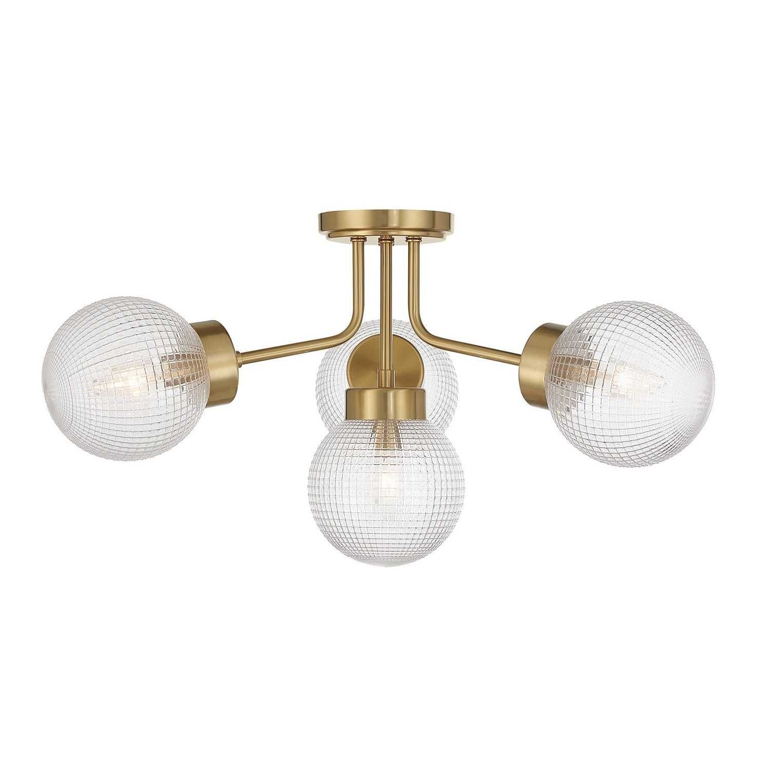 Bright and inviting, the Savoy House Coral 4-light semi-flush mount pairs its subtly sculpted arms with radiant orbs of clear matrix glass. The Warm Brass finish enhances the design's warmth, making it an ideal choice for spaces that benefit from both glow and sophistication. Coral is 13" tall and 27" wide. It uses four candelabra size bulbs of up to 60 watts per bulb (not included).