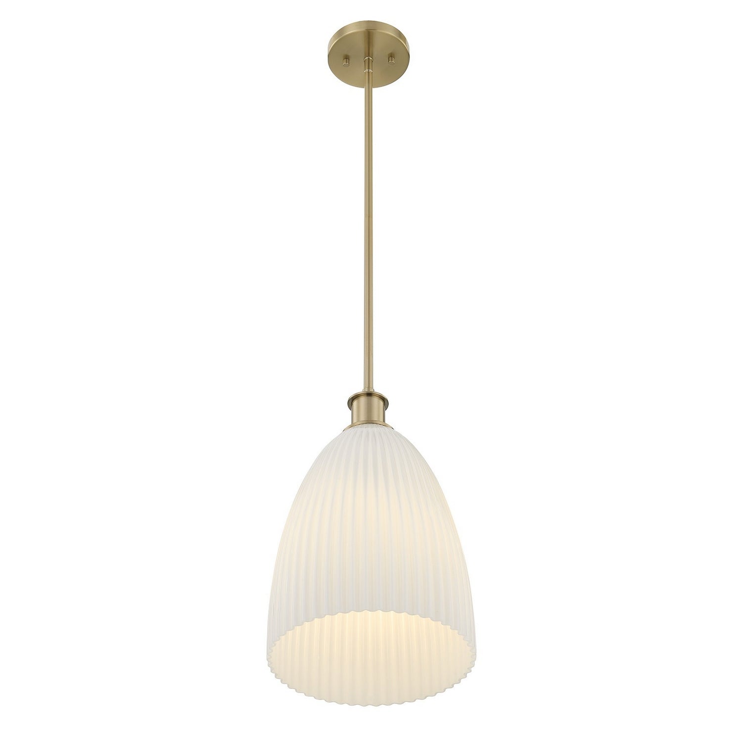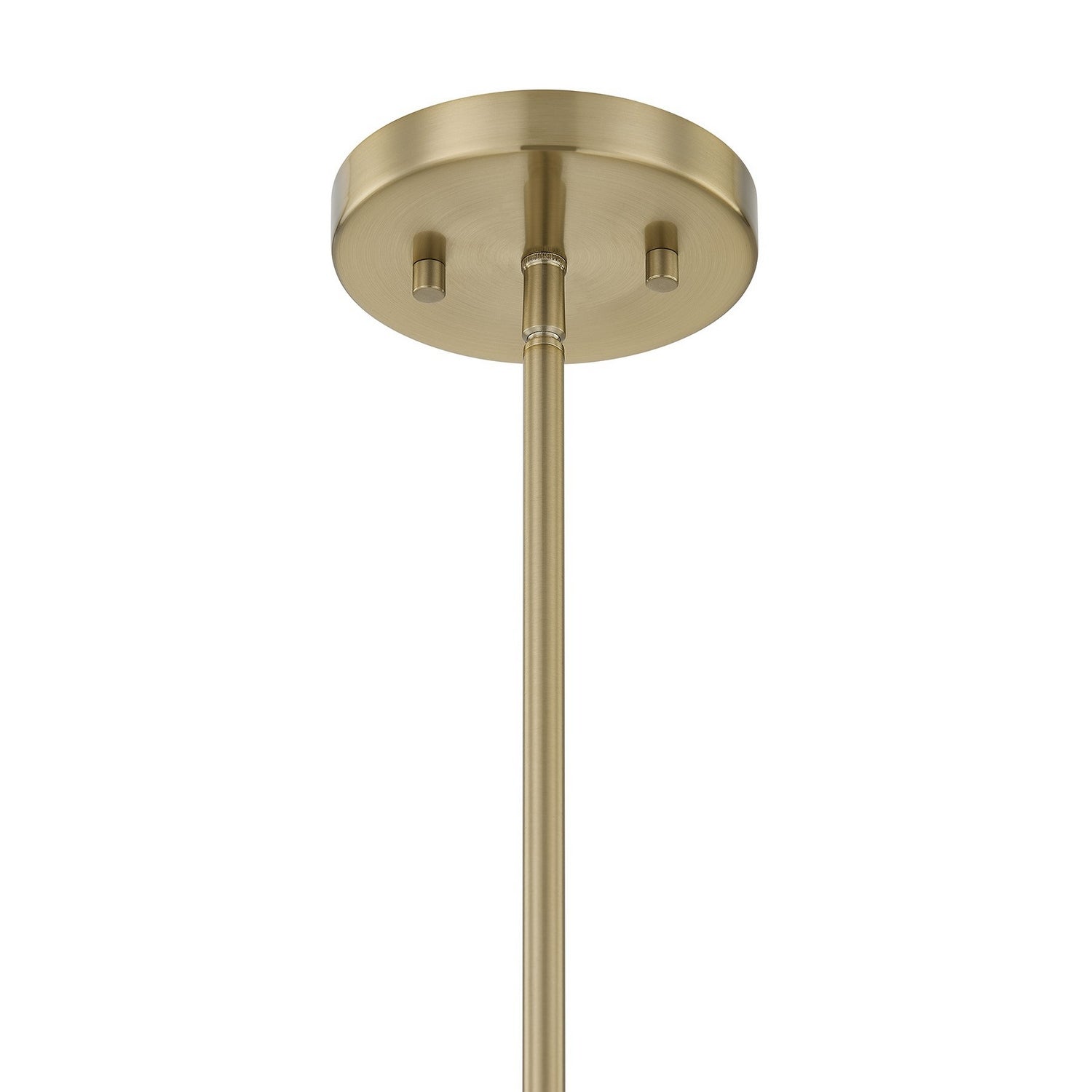 Illuminate with modern charm using the Savoy House Baldwin 1-light pendant. A single ribbed opal glass shade takes center stage, gracefully suspended from a warm Noble Brass structure that enhances any room with its soft, sculptural elegance. Baldwin is 10" in width and offers an adjustable height ranging from 15.6" to 69.6". It uses one standard size bulb of up to 60 watts. Bulb not included. Includes four 12" downrods and one 6" downrod.