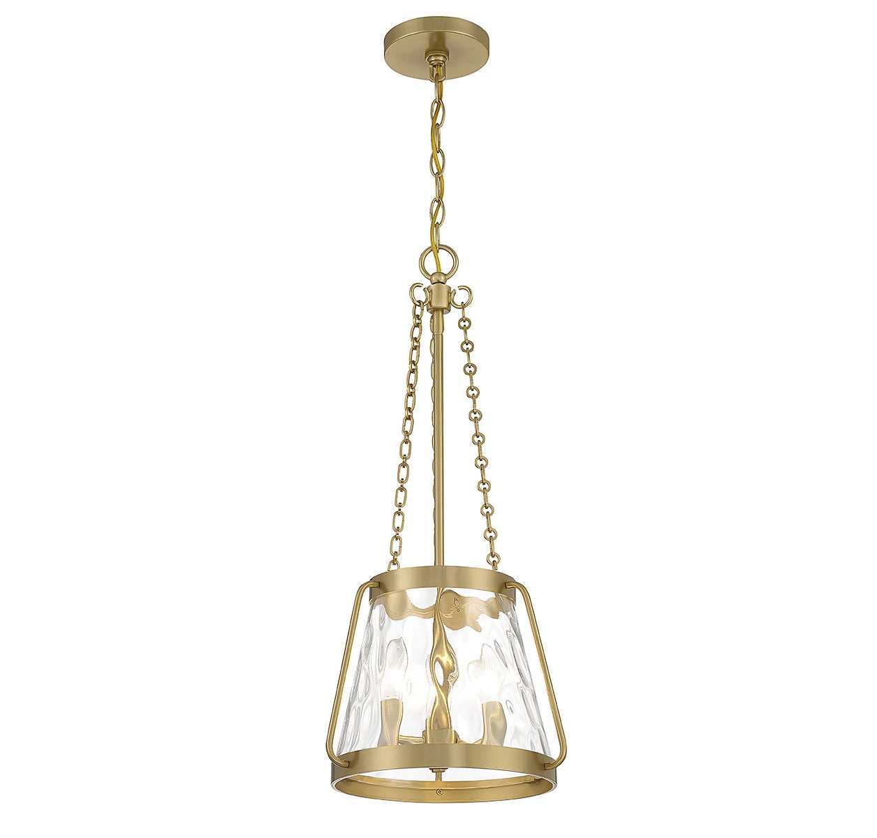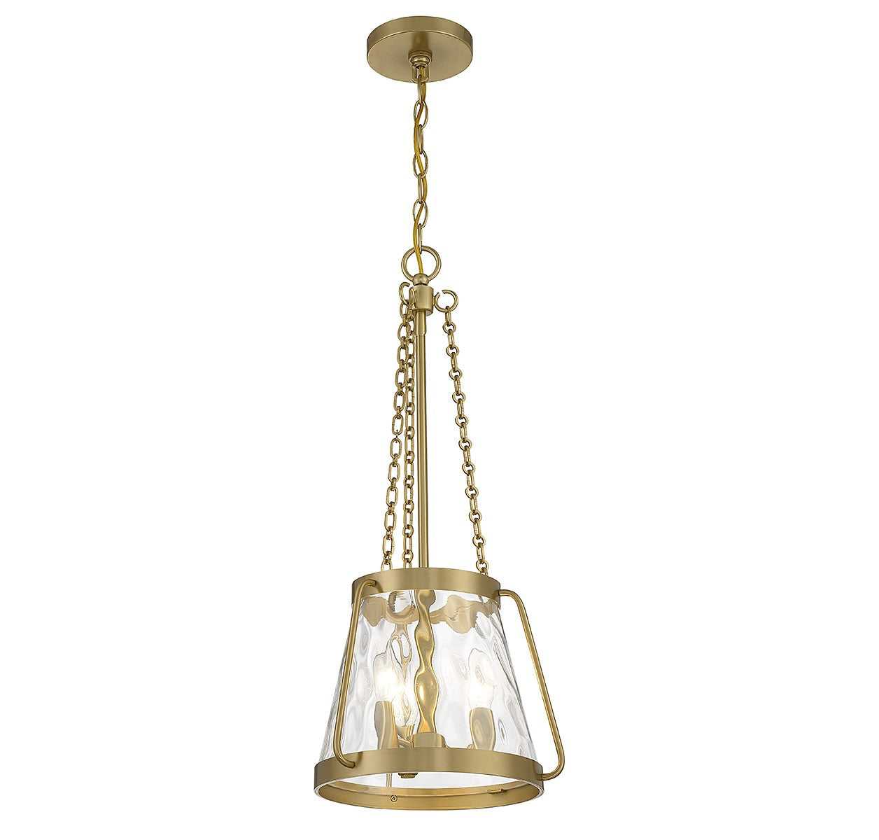 The Savoy House Crawford 3-light pendant proves that a classic style can be stunning! A lantern-inspired shade of clear water glass hangs down from an understated structure with industrial-inspired details. Finished in warm brass. Crawford is 25.5" in height and 12" in width. It uses 3 candelabra size bulbs of up to 60 watts per bulb (bulbs not included).