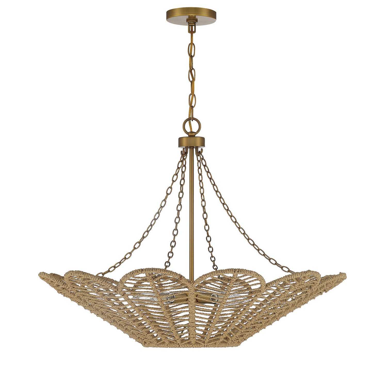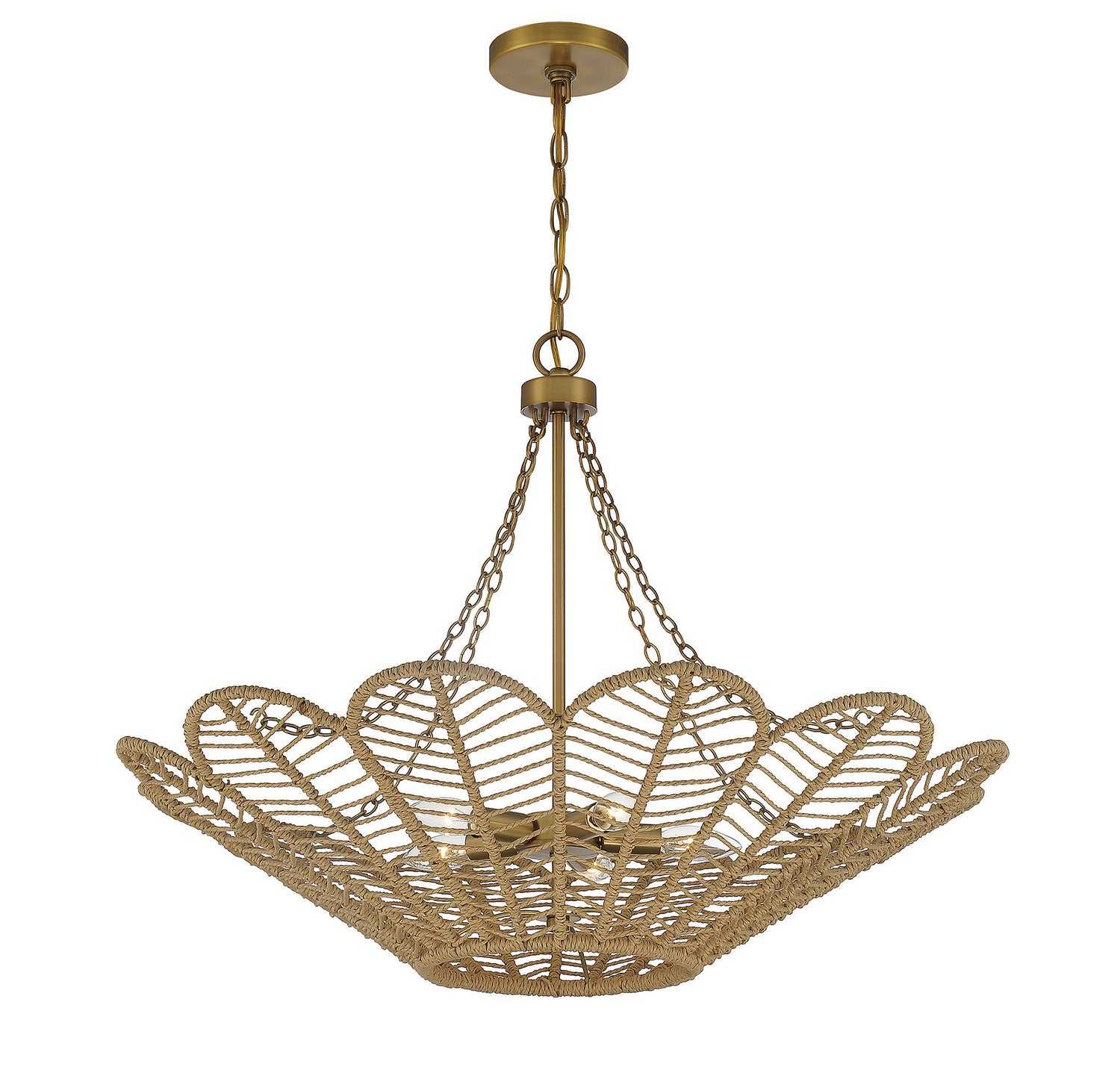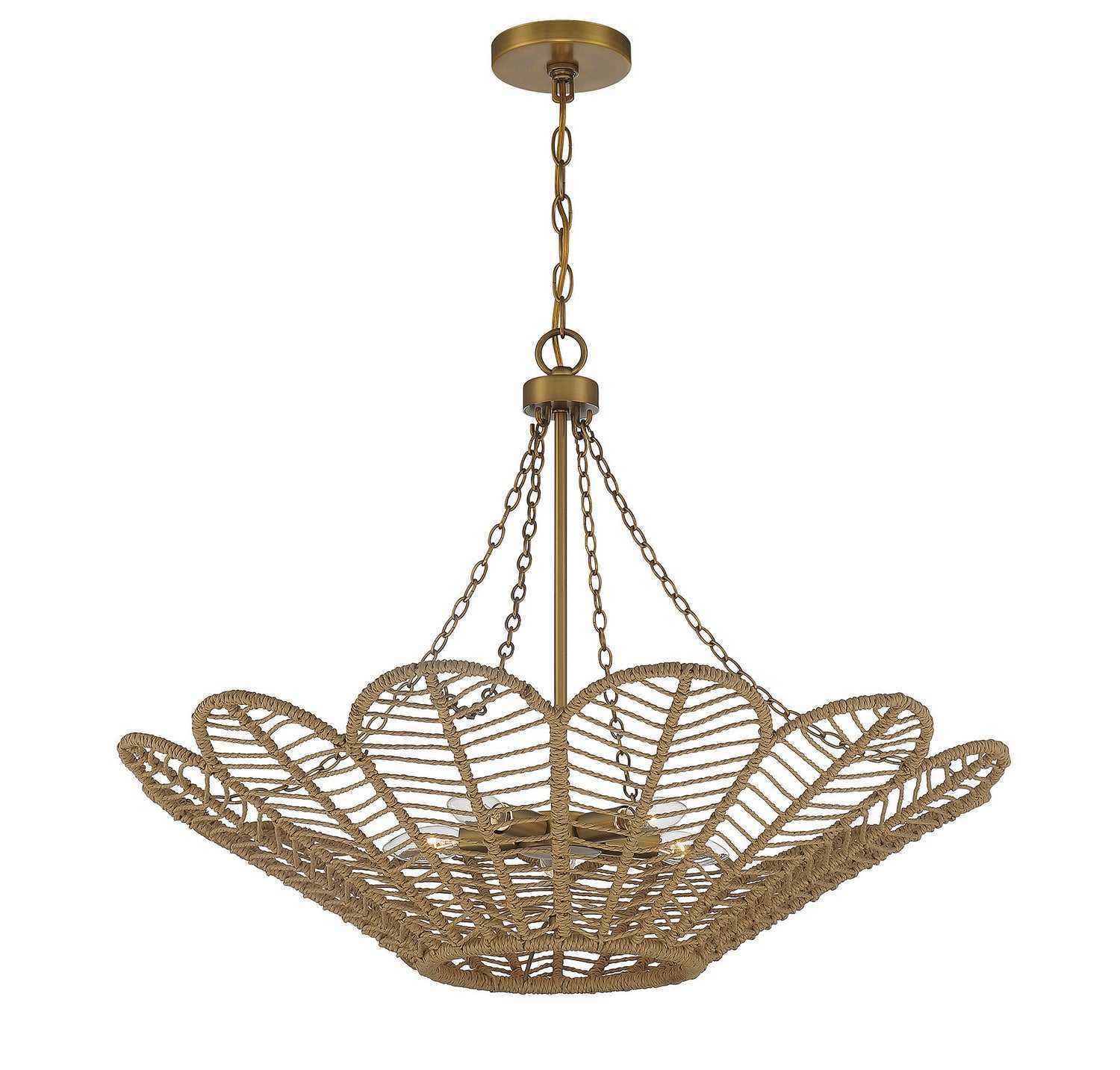 With a look recalling the iconic style of rattan furniture, the Savoy House Cyperas 5-light pendant brings organic-inspired style to your home. Its structure, which is flower-like in shape, is wrapped in rope and finished in warm brass. It is 22" in height and 30" in diameter. It uses five candelabra size bulbs of up to 60 watts per bulb. Comes with 120" of chain and 144" of cord.