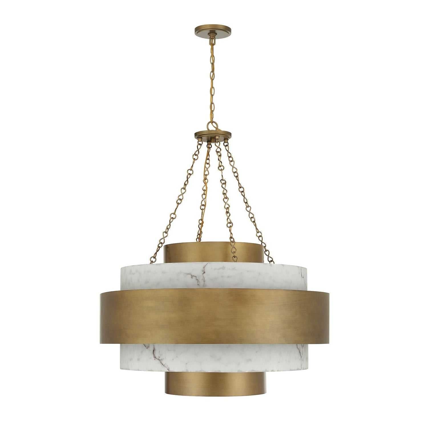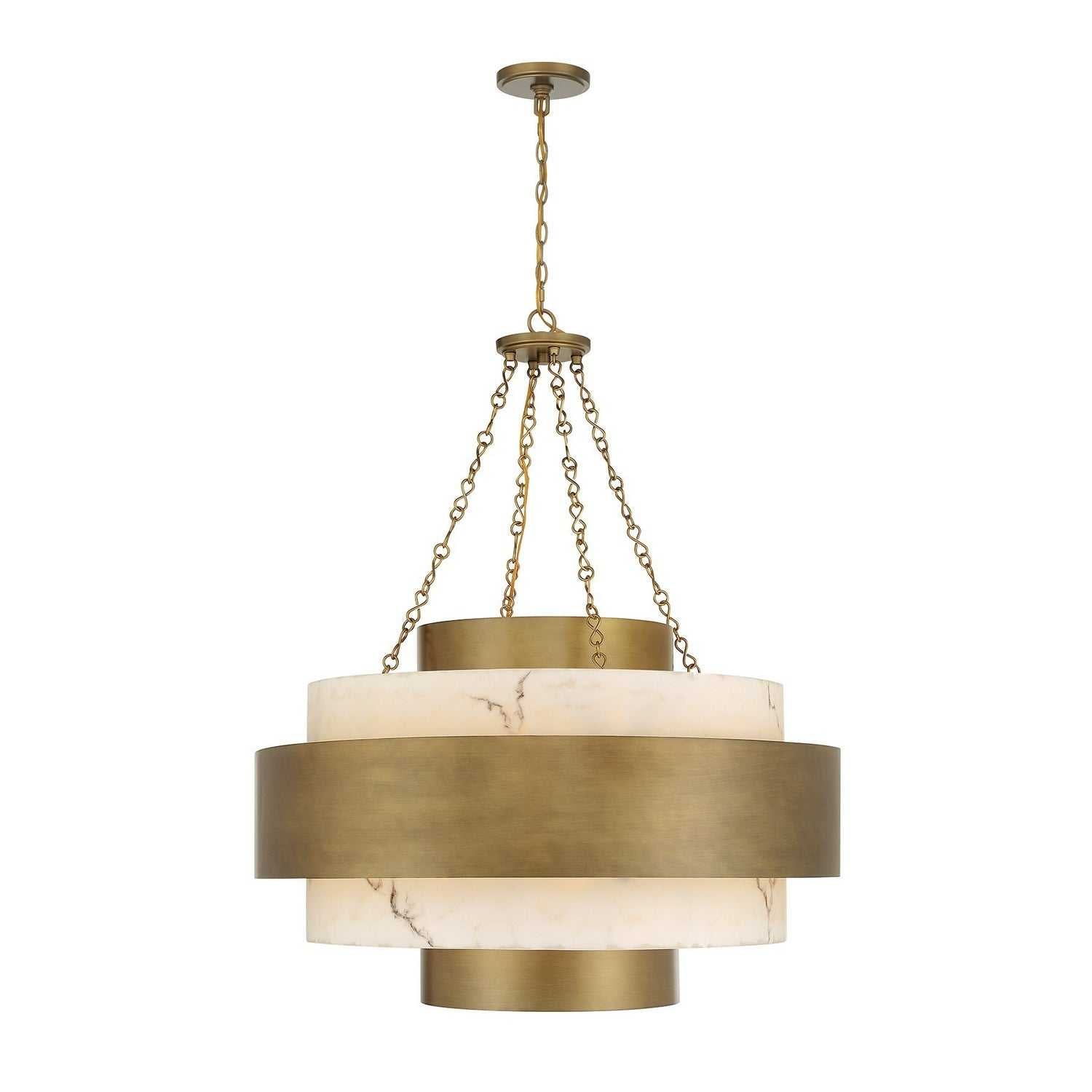 Inspired by glamorous Art Deco influences, the Savoy House Davenport 8-light pendant brings refined drama to any room. Bands finished in Antique Patina encircle panels of lifelike faux alabaster, creating a rich, dimensional effect that glows beautifully from within. Davenport is 43" in height and 36" in width. Uses eight candelabra size bulbs of up to 60 watts per bulb. Bulbs not included. Comes with 120" of chain.