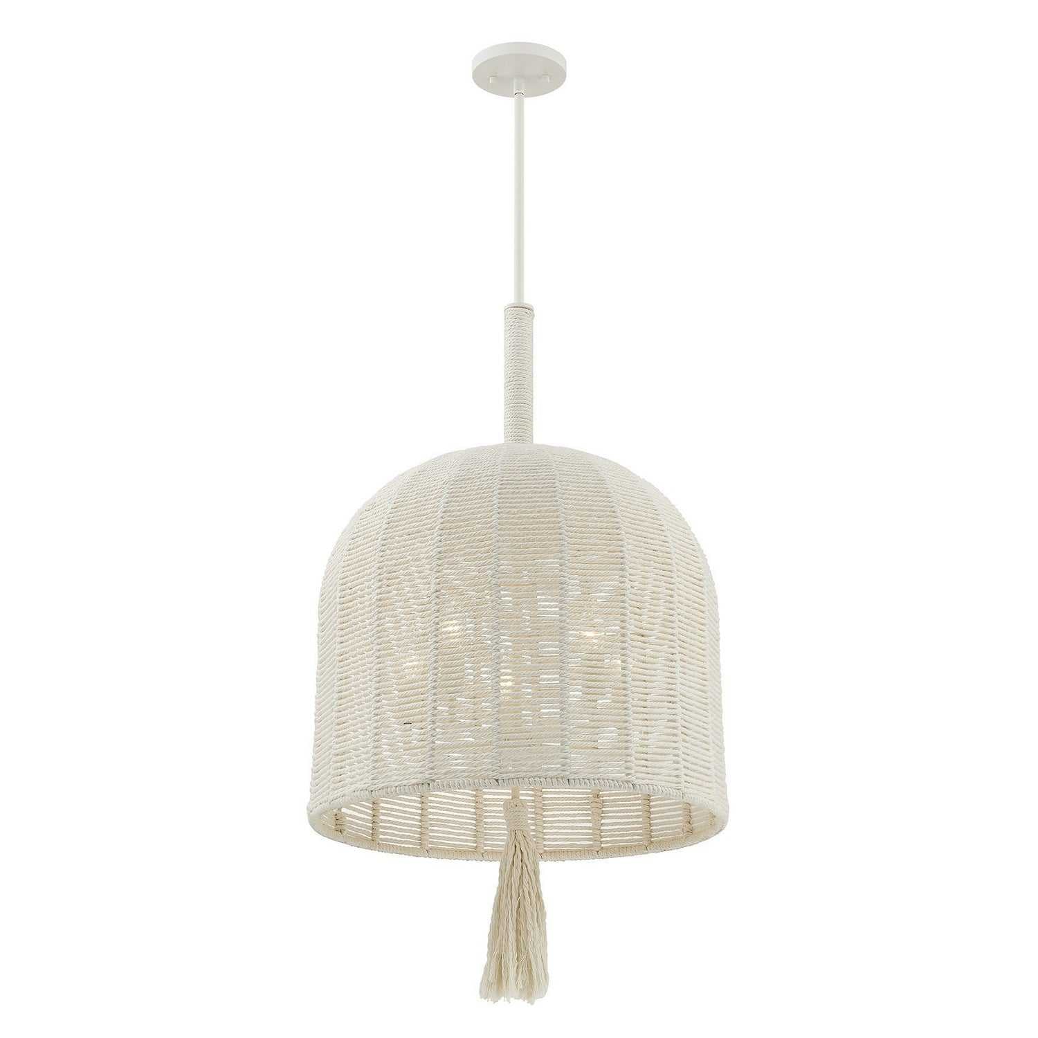 The Savoy House Lunara 5-light pendant was designed by award-winning interior designer and TV host Breegan Jane. With its woven shade and tassel crafted from cotton rope, it brings a breezy, unhurried spirit inspired by California living. The Painted White Alabaster finish is a flawless match for the cotton rope. Lunara is 20" in width and has an adjustable height ranging from 33" to 87". It uses five candelabra size bulbs of up to 60 watts per bulb. Bulbs not included. Comes with four 12" downrods and one 6" downrod.
