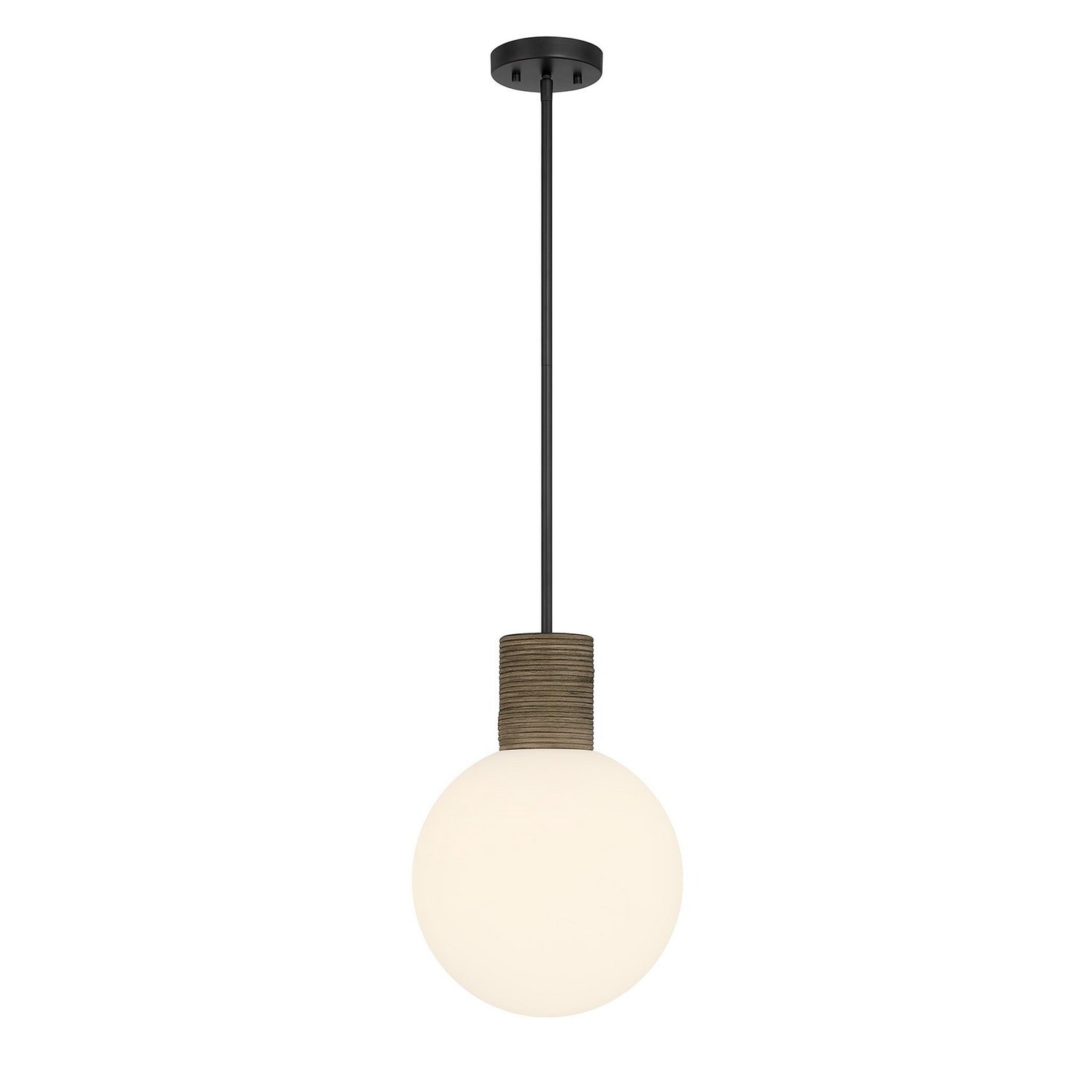 Bring fresh, organic appeal into any room with the Savoy House Jarrell 1-light pendant. An orb of white opal glass is wrapped with dark rattan and paired with a Matte Black finish for a look that's modern yet relaxed. Jarrell is 12" wide and offers an adjustable height ranging from 16.5" to 70.5". It uses one standard size of bulb up to 60 watts (bulb not included) and comes with four 12" downrods and one 6" downrod.