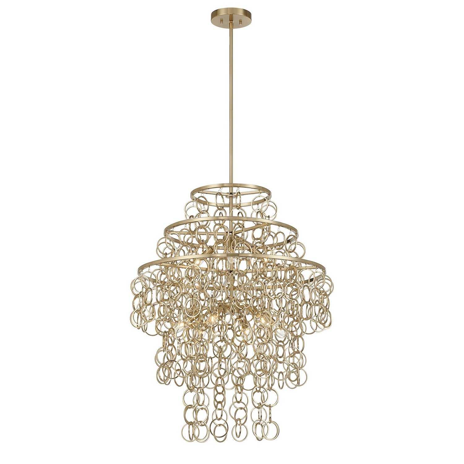 Designed by award-winning interior designer and TV host Breegan Jane, the Savoy House Setentas 9-light pendant brings seventies glamour into the modern era. Cascading strands of round chain shimmer in three luxurious tiers, all finished in radiant Noble Brass. The effect is a glowing waterfall of metallic texture - bold, playful, and irresistibly stylish. Setentas is 28" wide and offers an adjustable height from 34" to 88". It uses nine candelabra size bulbs of up to 60 watts per bulb (not included) and comes with four 12" downrods and one 6" downrod. This dramatic pendant turns any space into a showcase of personality and designer-driven elegance.