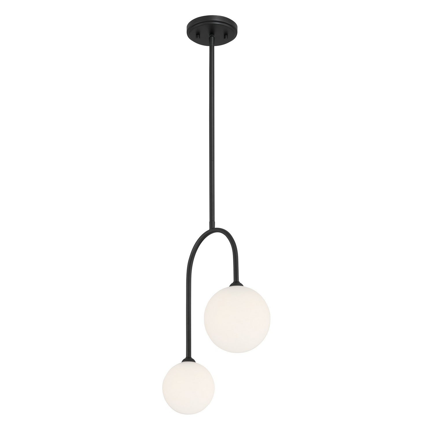 Playful geometry meets bold style in the Savoy House Chester 2-light pendant. Two sizes of white opal glass orbs rest on gently curving arms, highlighted by a Matte Black finish for extra impact. Chester is 12" in width and has an adjustable height ranging from 17.5" to 71.5". It uses two G9 bulbs of up to 60 watts per bulb. Bulbs not included. Comes with four 12" downrods and one 6" downrod.