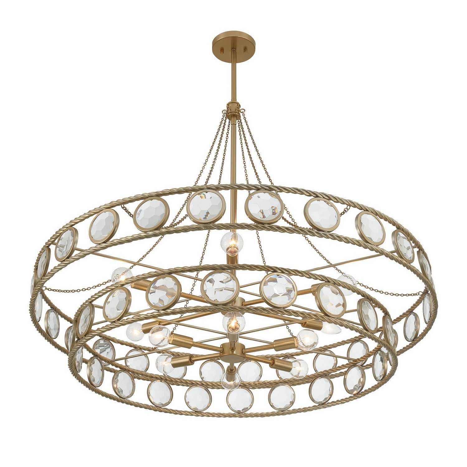 Double the drama with the Cologne 12-light pendant. This two-tiered wagon-wheel form holds clear, faceted glass disks trimmed with braided-rope detail, creating a combination that brings jewelry-inspired glamour into any space. The Opulent Gold finish enhances every angle, ensuring a radiant impression day or night. Cologne is 38" wide and adjustable from 32" to 86" in height. Uses twelve candelabra size bulbs of up to 60 watts per bulb (not included). Includes four 12" downrods and one 6" downrod.