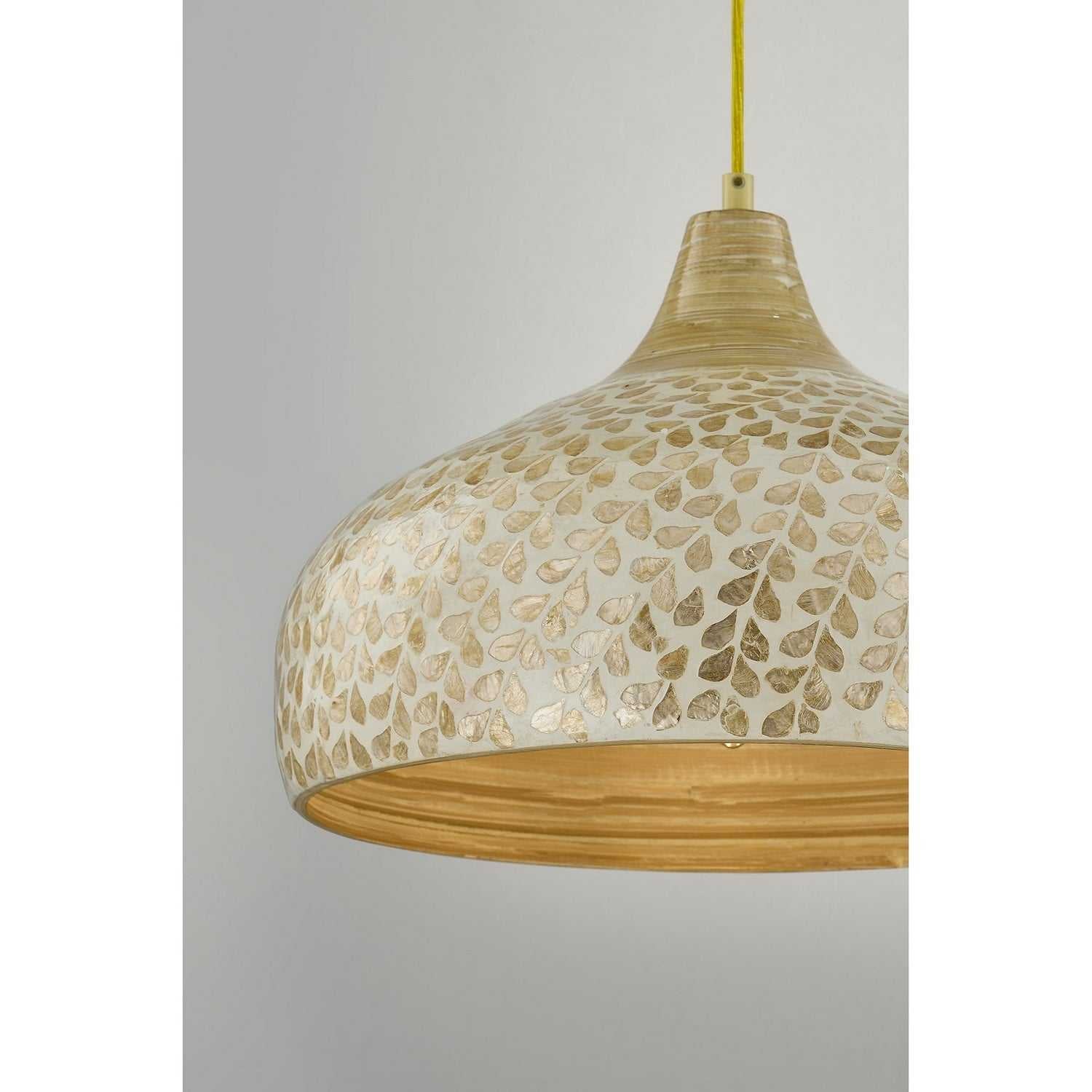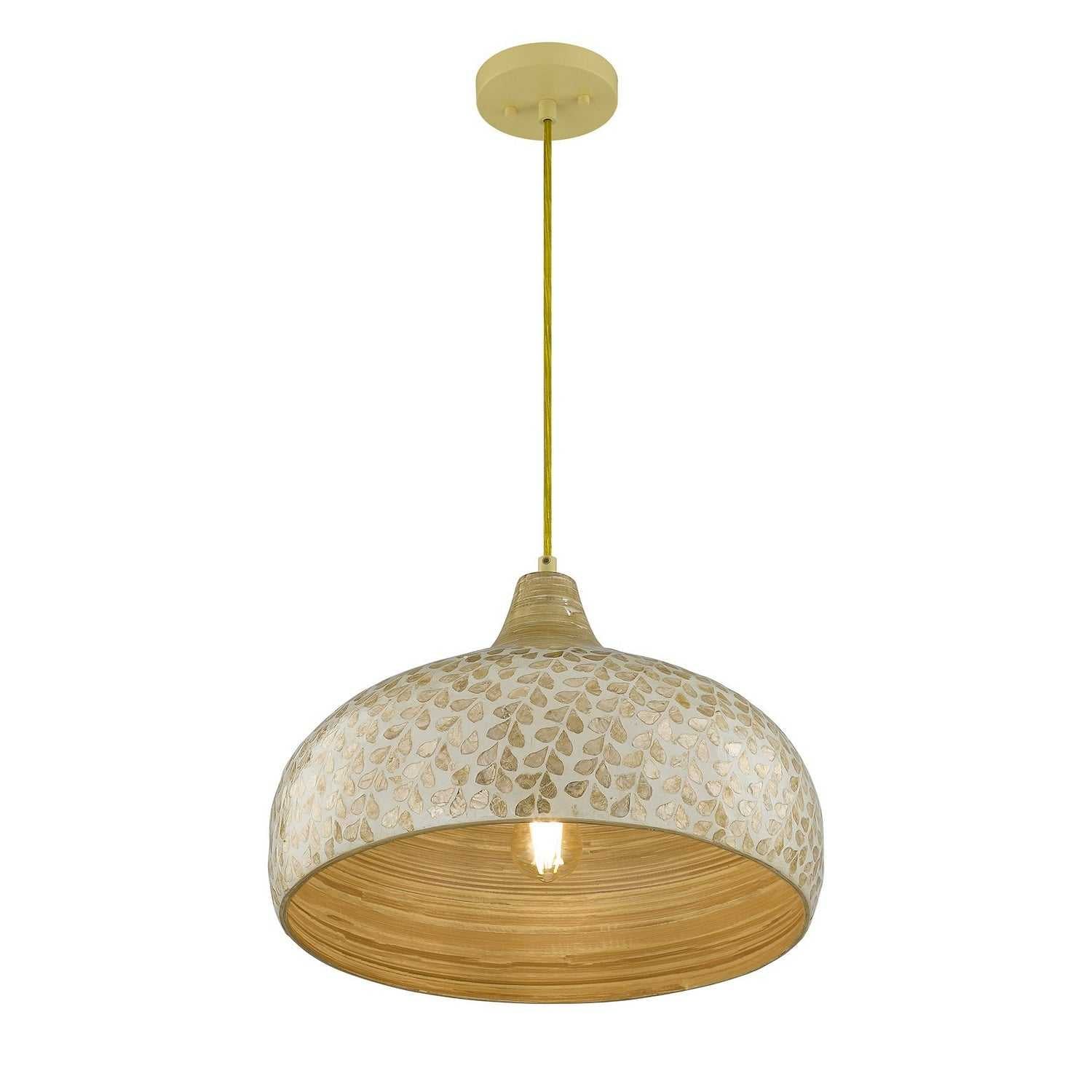 Bring a touch of organic magic to any room with the Savoy House Kemp 1-light pendant. Its spun bamboo shade is inlaid with a shimmering shell pattern that catches the light beautifully, creating a warm, artful glow. The Ivory and Gold Shell finish enriches the natural textures and adds a refined coastal edge. Kemp is 17.75" wide and has an adjustable height ranging from 12" to 132". It uses one standard size bulb of up to 60 watts. Bulb not included. Comes with 120" of hanging cord.