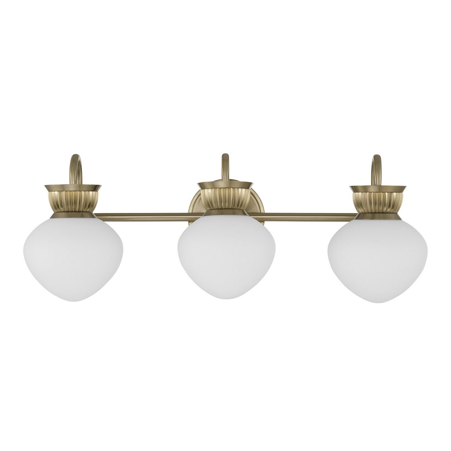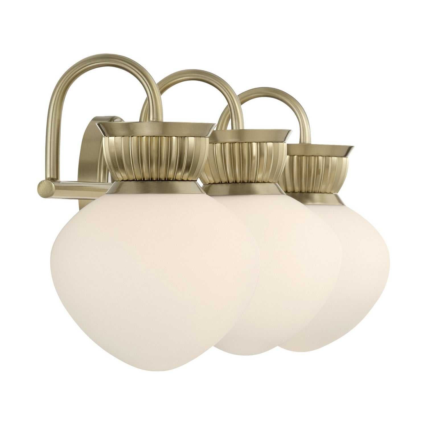 Vintage inspiration gets a stylish update in the Savoy House Melbourne 3-light bath vanity light. White opal glass shades, classic ribbed details and sweeping curved arms combine with the warm versatility of a Noble Brass finish for a look that feels both timeless and tailored. Melbourne is 9.25" in height, 25.5" in width and extends 7.5" from the wall. Uses three candelabra size bulbs of up to 60 watts per bulb. Bulbs not included. Can be mounted with shades facing up or down.