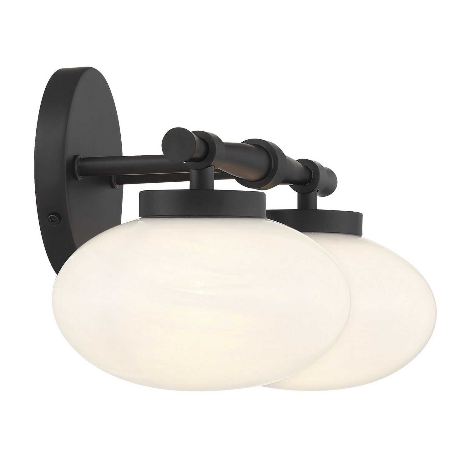 Add a hint of midcentury modern style to your bath with the Savoy House Barrow 2-light bath light. Oval-shaped shades of swirling, stunning strie glass hang down from stylized arms that are, like the round backplate, finished in Black. Barrow is 8" in height, 17" in width and extends 8" from the wall. It uses two G9 bulbs of up to 60 watts per bulb. Bulbs not included. Install as shown. This bath bar is damp area rated.