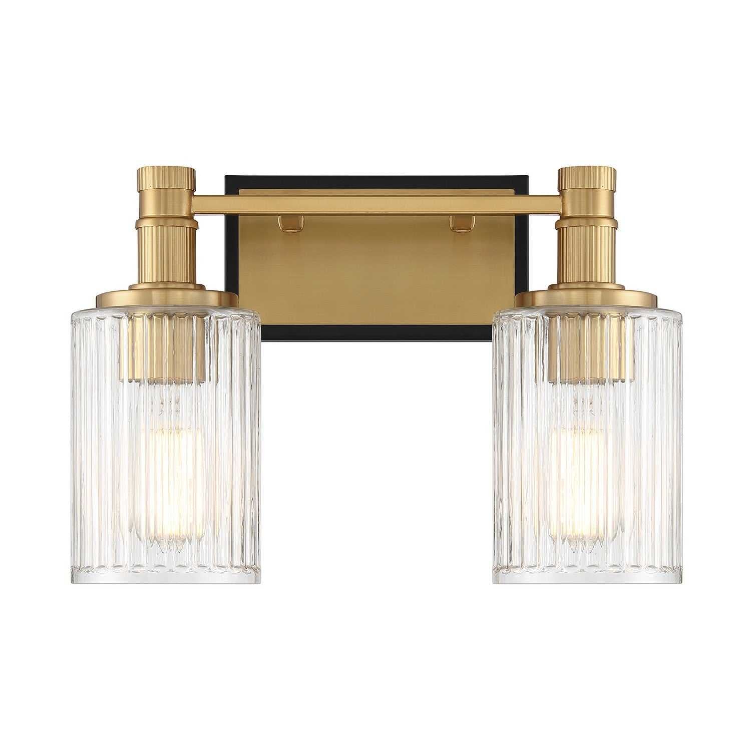 Add a big dose of shimmer with the Concord 2-light bath vanity light from Savoy House. Its ribbed glass shades are paired with ribbed detailing on the arms, boosting the inviting texture. The Matte Black and Warm Brass finish helps every element shine. Concord is 10.5" in height, 15" in width and extends 6.5" from the wall. Uses two standard size bulbs of up to 60 watts per bulb. Bulbs not included. Damp area rated. Must be installed as shown.