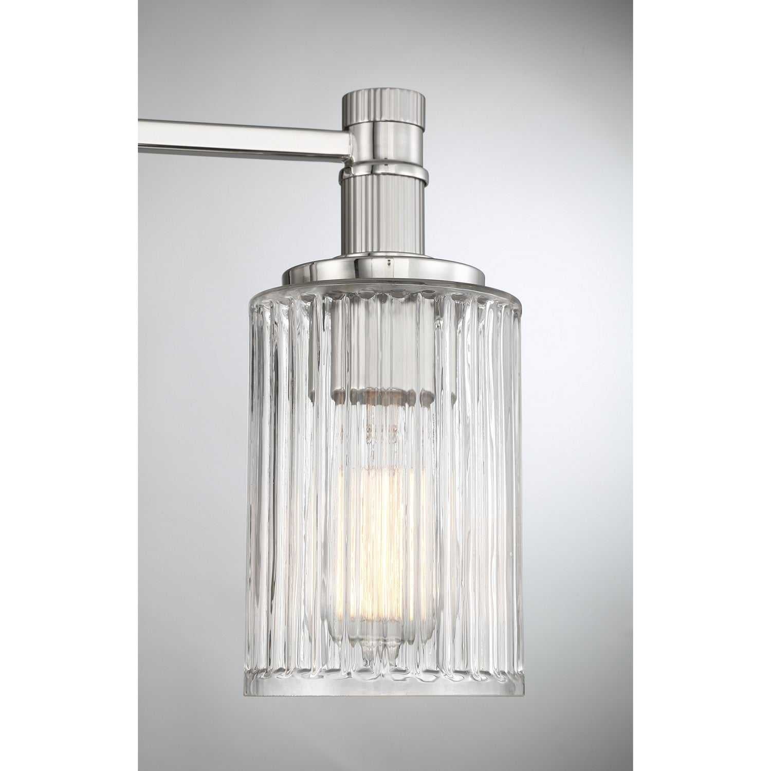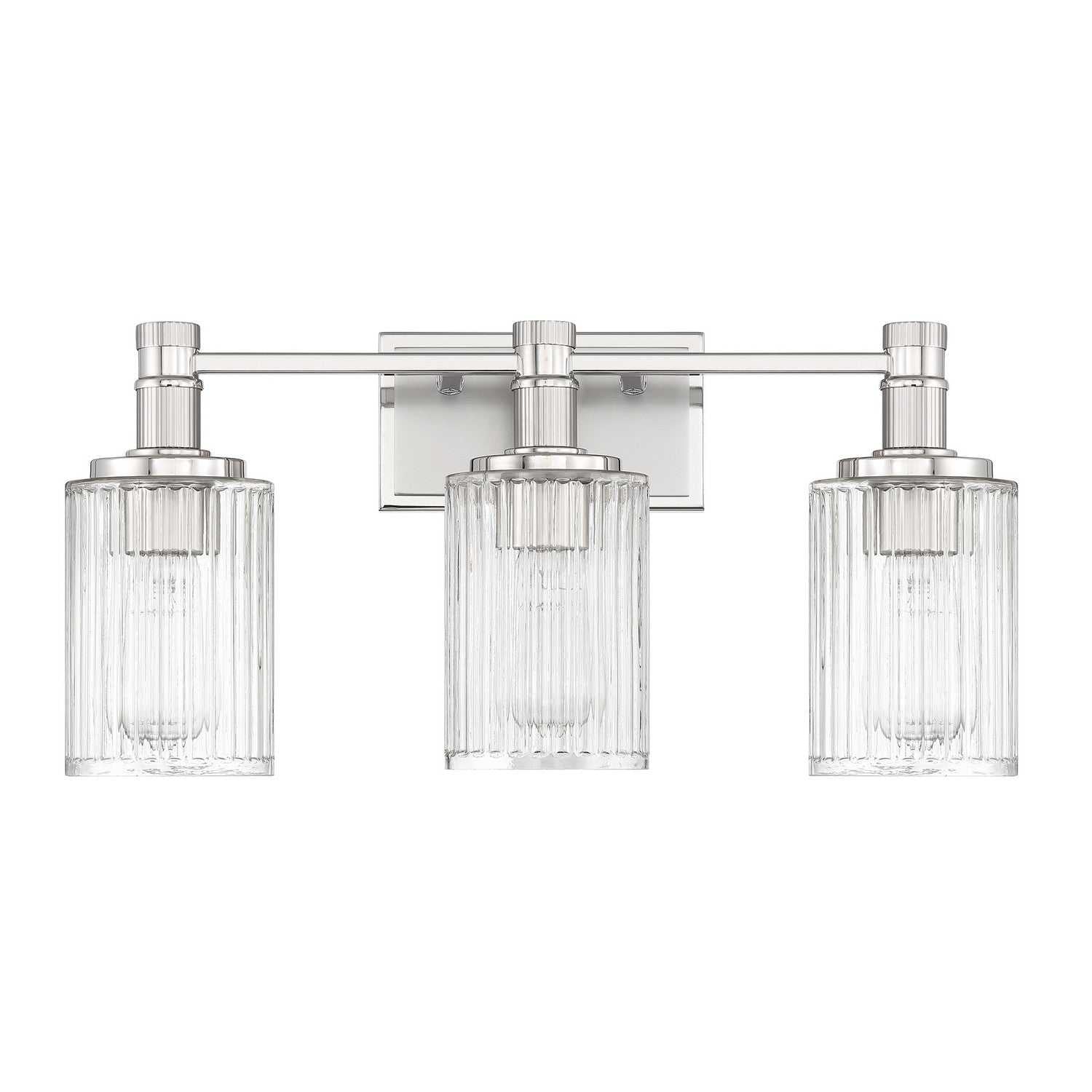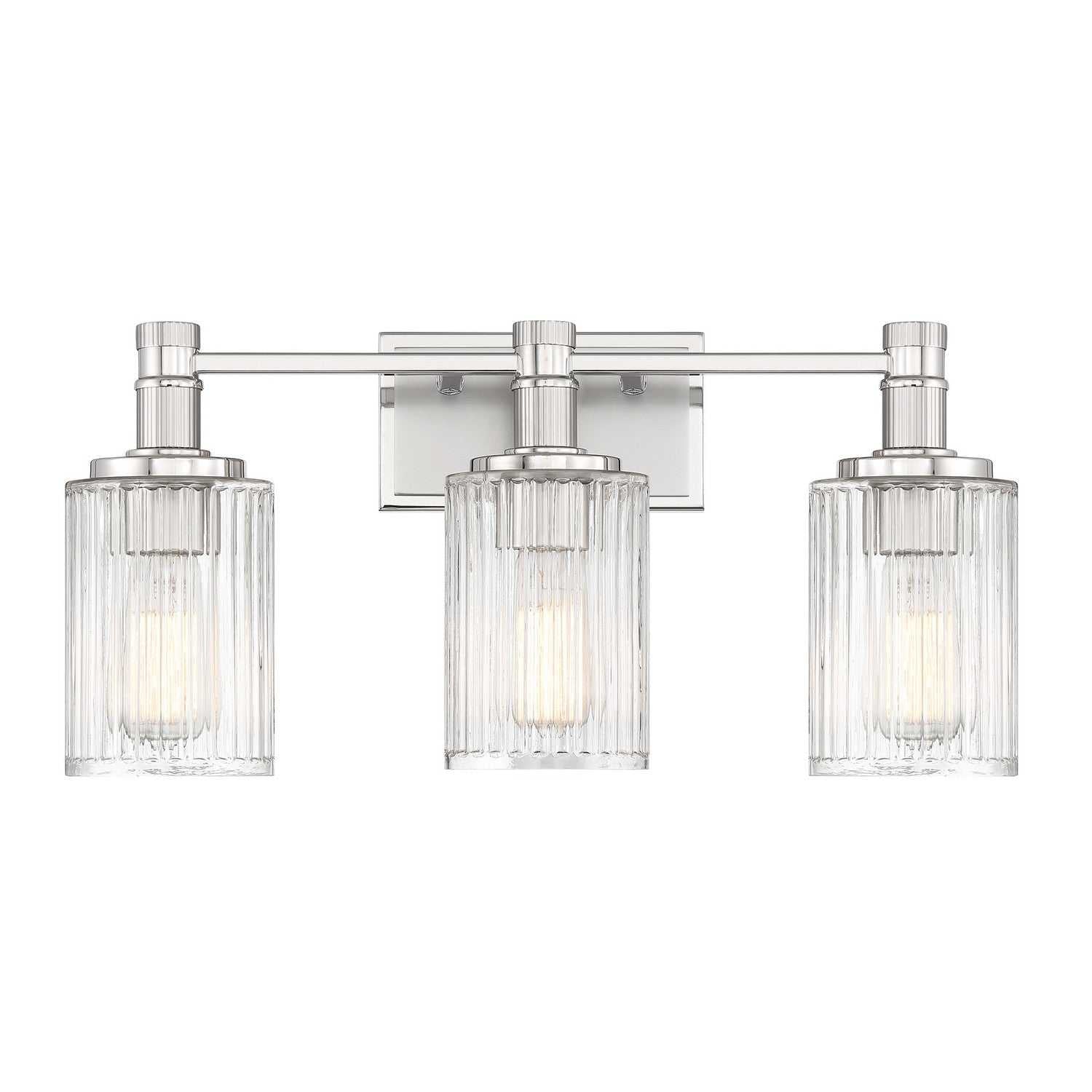 Add a big dose of shimmer with the Concord 3-light bath vanity light from Savoy House. Its ribbed glass shades are paired with ribbed detailing on the arms, boosting the inviting texture. The Silver and Polished Nickel finish helps every element shine. Concord is 10.5" in height, 22" in width and extends 6.5" from the wall. Uses three standard size bulbs of up to 60 watts per bulb. Bulbs not included. Damp area rated. Must be installed as shown.