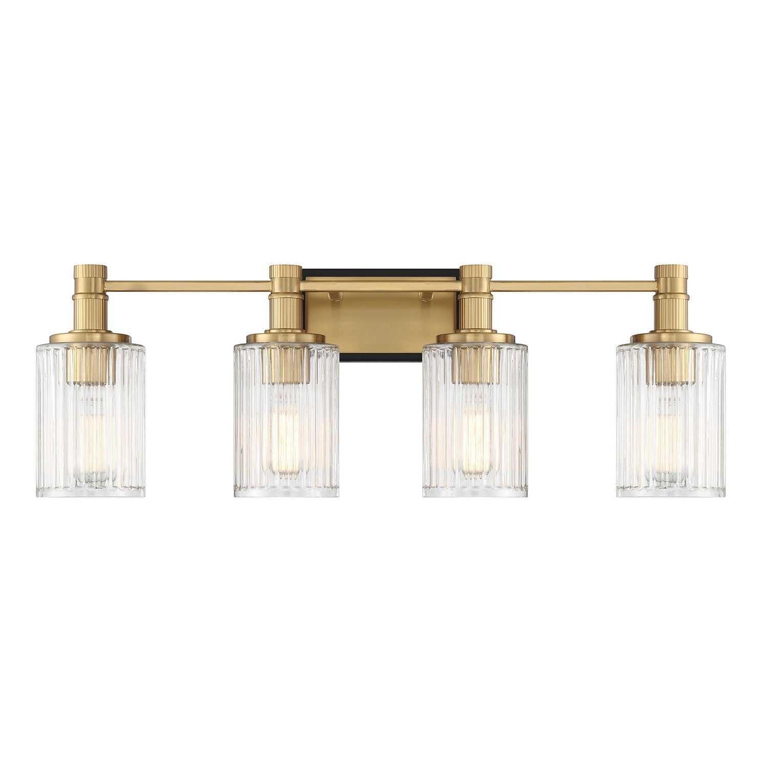 Add a big dose of shimmer with the Concord 4-light bath vanity light from Savoy House. Its ribbed glass shades are paired with ribbed detailing on the arms, boosting the inviting texture. The Matte Black and Warm Brass finish helps every element shine. Concord is 10.5" in height, 30.75" in width and extends 6.5" from the wall. Uses four standard size bulbs of up to 60 watts per bulb. Bulbs not included. Damp area rated. Must be installed as shown.