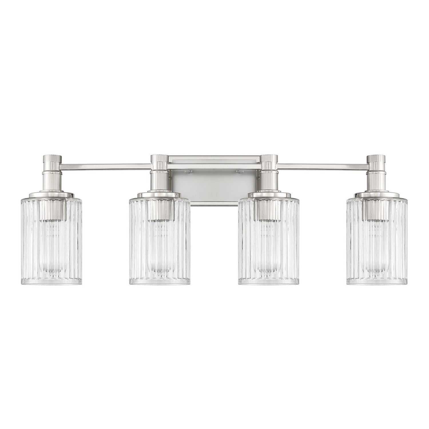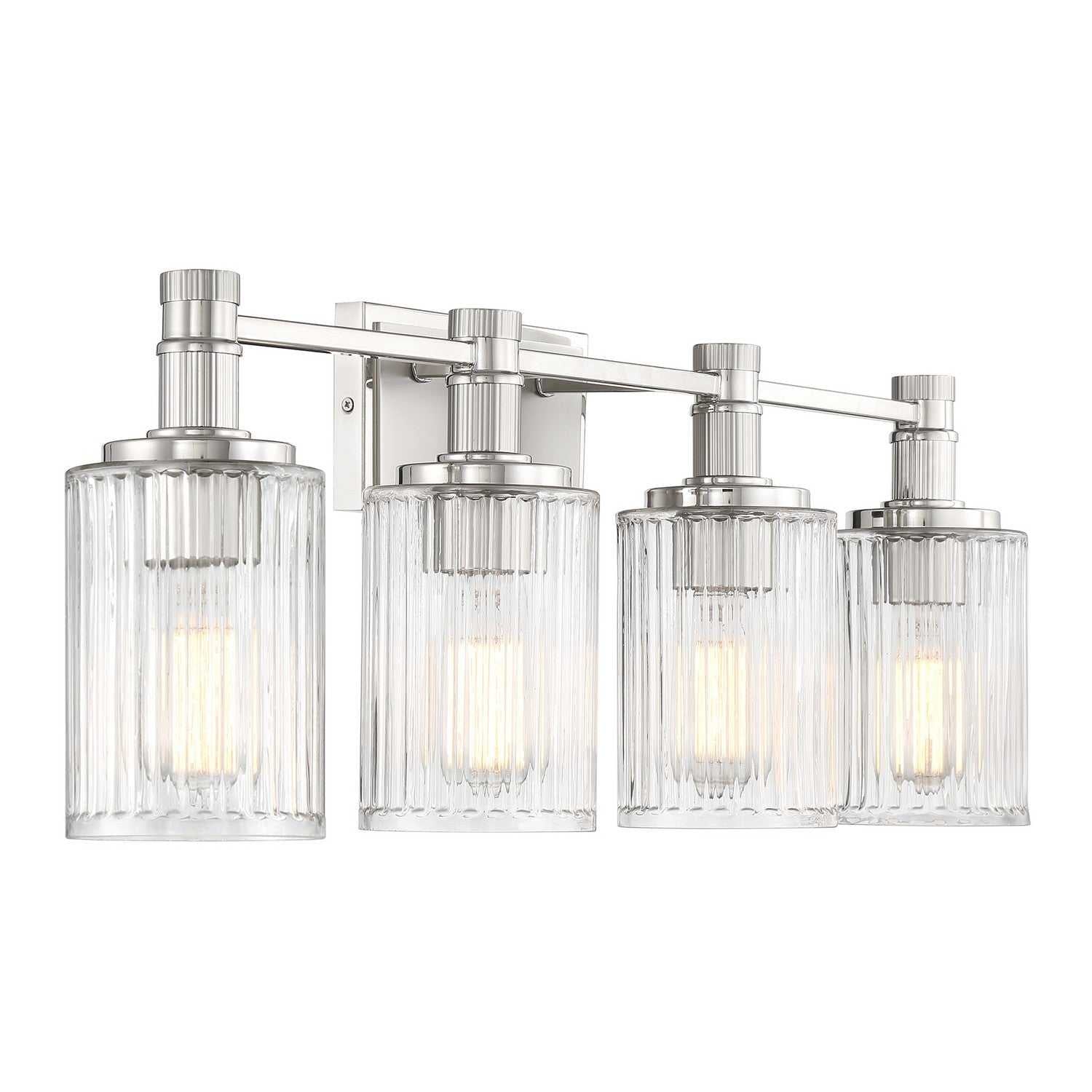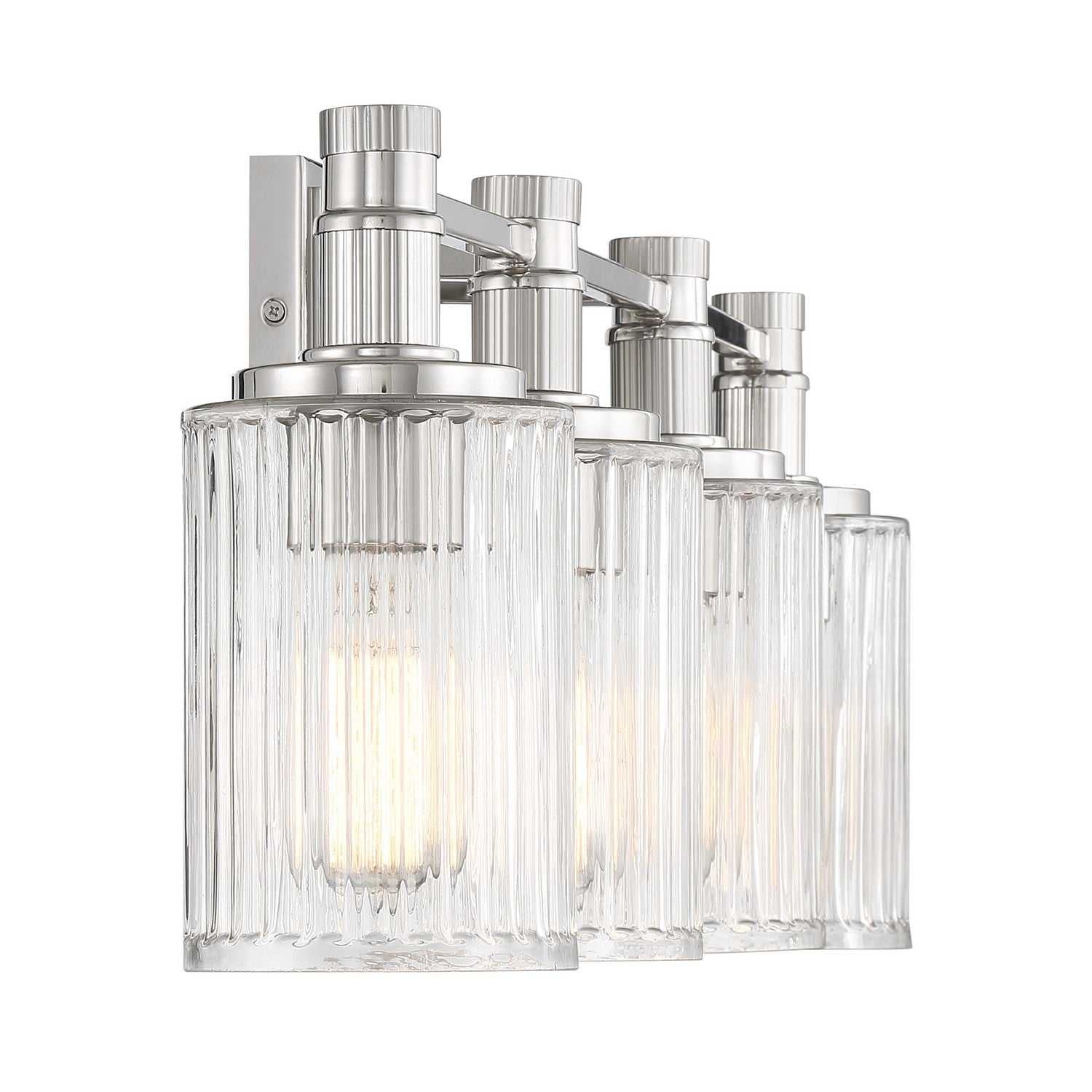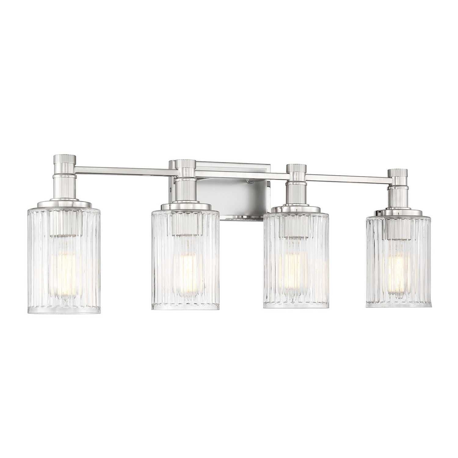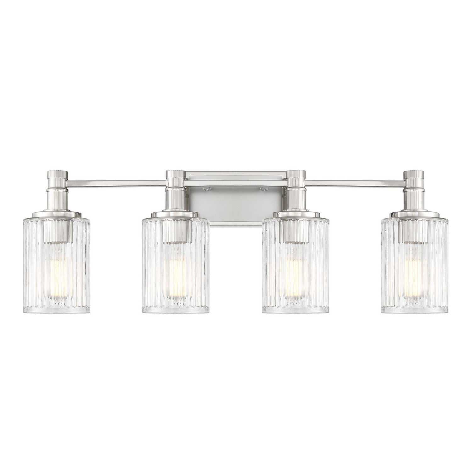 Add a big dose of shimmer with the Concord 4-light bath vanity light from Savoy House. Its ribbed glass shades are paired with ribbed detailing on the arms, boosting the inviting texture. The Silver and Polished Nickel finish helps every element shine. Concord is 10.5" in height, 30.75" in width and extends 6.5" from the wall. Uses four standard size bulbs of up to 60 watts per bulb. Bulbs not included. Damp area rated. Must be installed as shown.