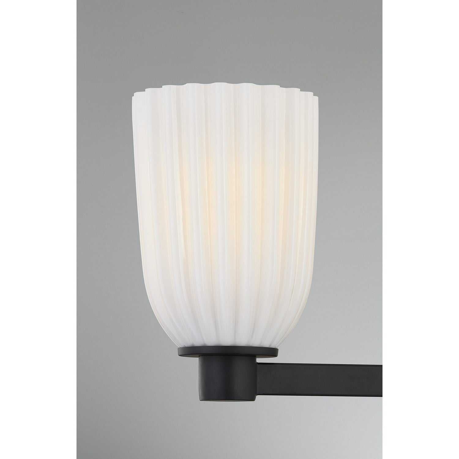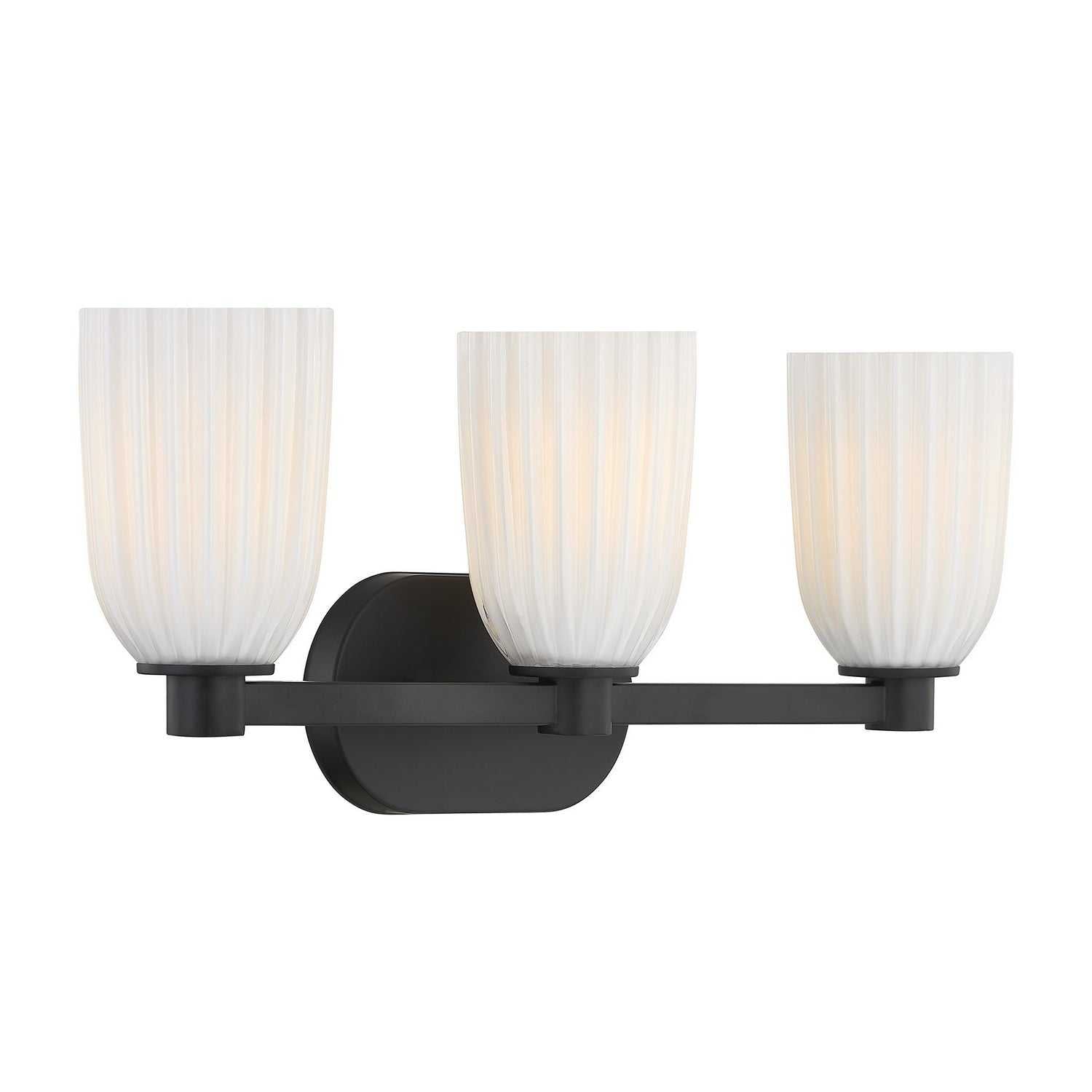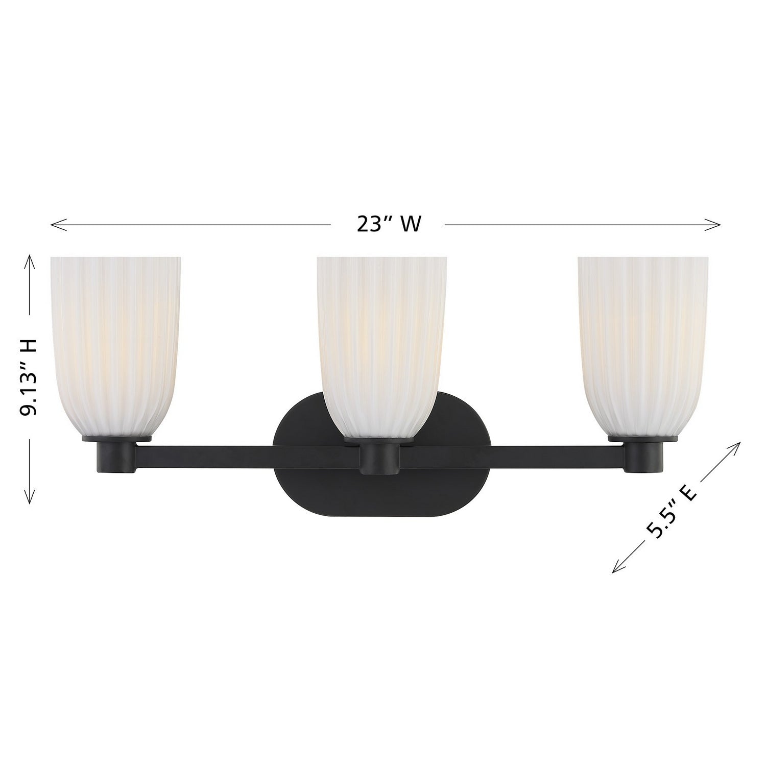 The Savoy House Baldwin 3-light bath vanity light combines striking contrast with everyday elegance. Its Matte Black finish frames the ribbed opal glass shades, creating a standout piece that remains versatile and welcoming. Baldwin is 9.13" in height, 23" in width and extends 5.5" from the wall. It uses three standard size bulbs of up to 60 watts per bulb. Bulbs not included. Damp area rated and can be installed horizontally or vertically.