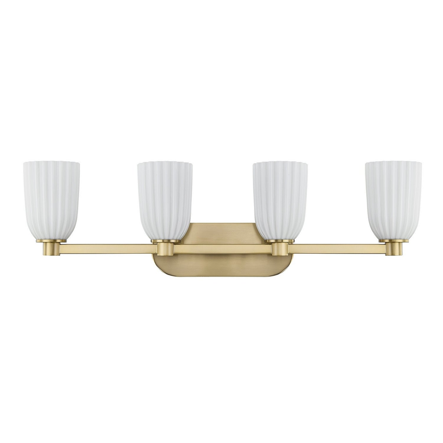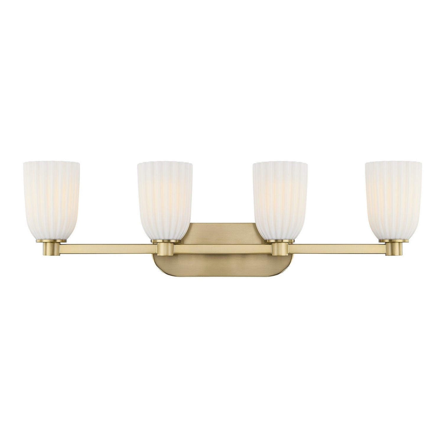 The Savoy House Baldwin 4-light bath bar brings soft sculptural beauty to your space. Set on a streamlined frame finished in Noble Brass, four ribbed opal glass shades cast a gentle, flattering glow that instantly elevates any bath. Baldwin stands 9.13" tall, spans 32", and extends 5.5" from the wall. It uses four standard size bulbs of up to 60 watts per bulb. Bulbs not included. Damp area rated and installable horizontally or vertically.