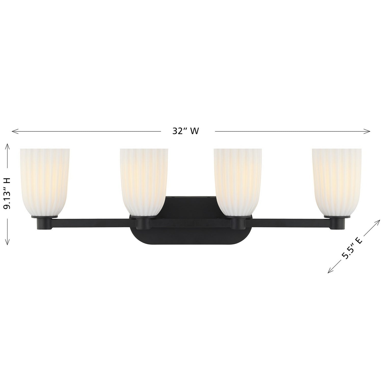 Bold yet beautifully understated, the Savoy House Baldwin 4-light bath bar layers a Matte Black finish with glowing ribbed opal glass to create striking modern contrast. Ideal for adding dimension and warmth to any bath. Baldwin stands 9.13" tall, spans 32", and extends 5.5" from the wall. It uses four standard size bulbs of up to 60 watts per bulb. Bulbs not included. Damp area rated and installable horizontally or vertically.