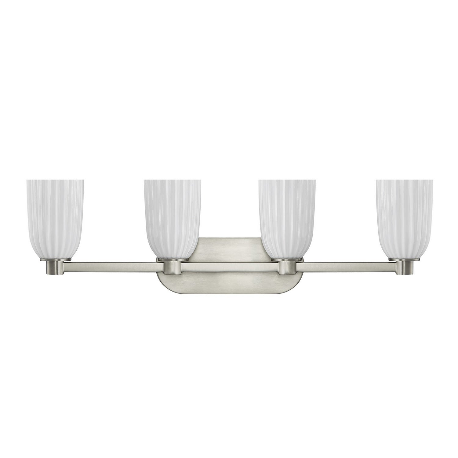 Clean lines and graceful curves come together in the Savoy House Baldwin 4-light bath bar. Its Satin Nickel finish brings a cool, contemporary edge while ribbed opal glass shades diffuse the light with soft elegance. Baldwin stands 9.13" tall, spans 32", and extends 5.5" from the wall. It uses four standard size bulbs of up to 60 watts per bulb. Bulbs not included. Damp area rated and installable horizontally or vertically.
